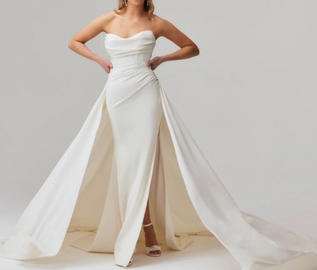 This is a brand new design released in 2024 by Jessica Coutures. I loved this dress because it gives you 2 looks for the price of one, it comes with an over skirt to make the dress more dramatic and for me the “ceremony” look with a bigger flowing skirt.