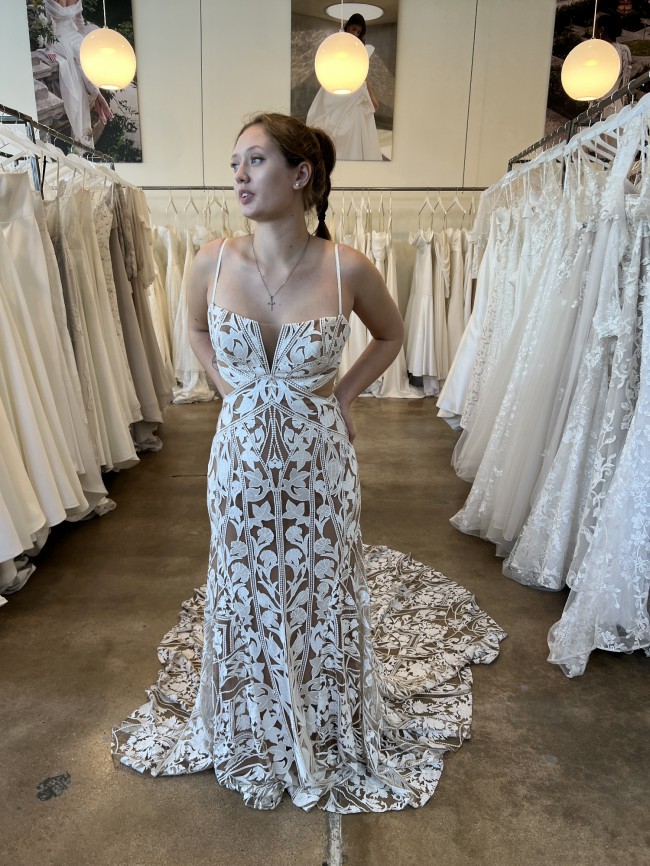 Austin's embroidered panels elongate and wrap around your body to sculpt the silhouette and accentuate the form. A straight neckline dips into a slight V for a contemporary touch, while straps and loops in the back provide support and structure to an open back. Item was a floor sample, may have minimal signs of wear. Dress is like new. Has never been altered.