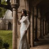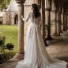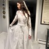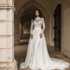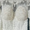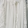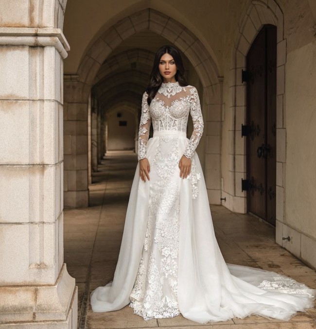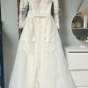 Dreamlike high neck lace gown with flattering fit & flare silhouette. Beautiful, flowy overskirt with train. Fits like US size 10. Check measurements to ensure an accurate fit. Never worn or altered. The dress looks just like the model photos in real life!