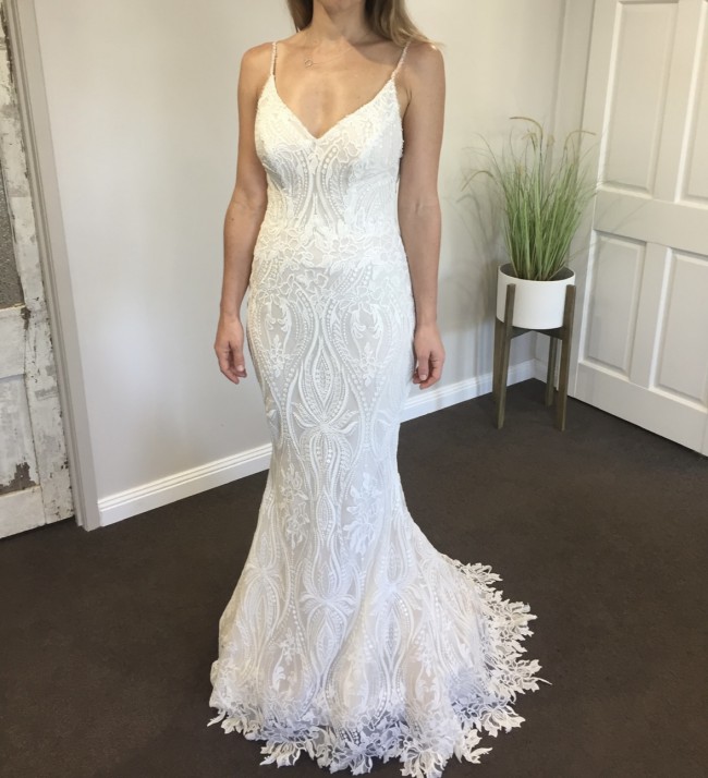 Dress is in mint condition, limited addition dress, hand made, beaded detail, beautiful embroidery. Stunning tail end with button to put up. Has been stored in air conditioned storage until now.
