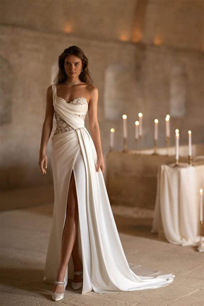 Carven is the epitome of elegance, she has an illusion corset bodice with beautiful floral appliques. She has an asymmetric one shoulder neckline, a wrapover skirt and a sexy high leg slit.