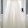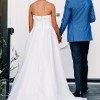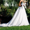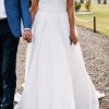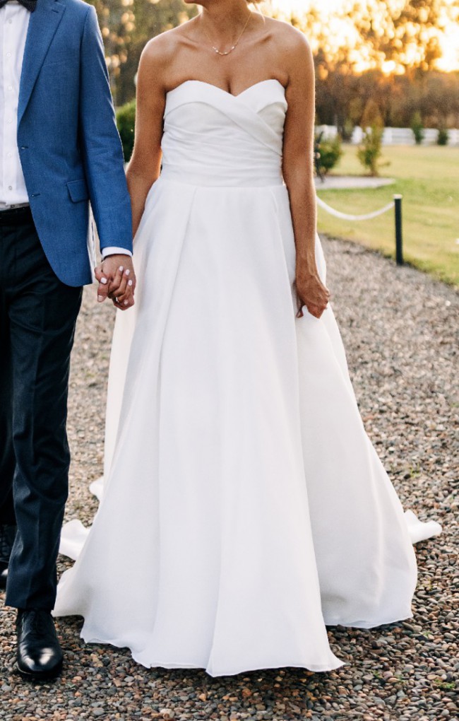This dress is the perfect modern version of an A-line ballgown, minus the heavy fabric and little to no movement. It was beautifully lightweight and flowy, and was comfortable for the entire day of my wedding. The neckline and silhouette means it is flattering on pretty much anyone!