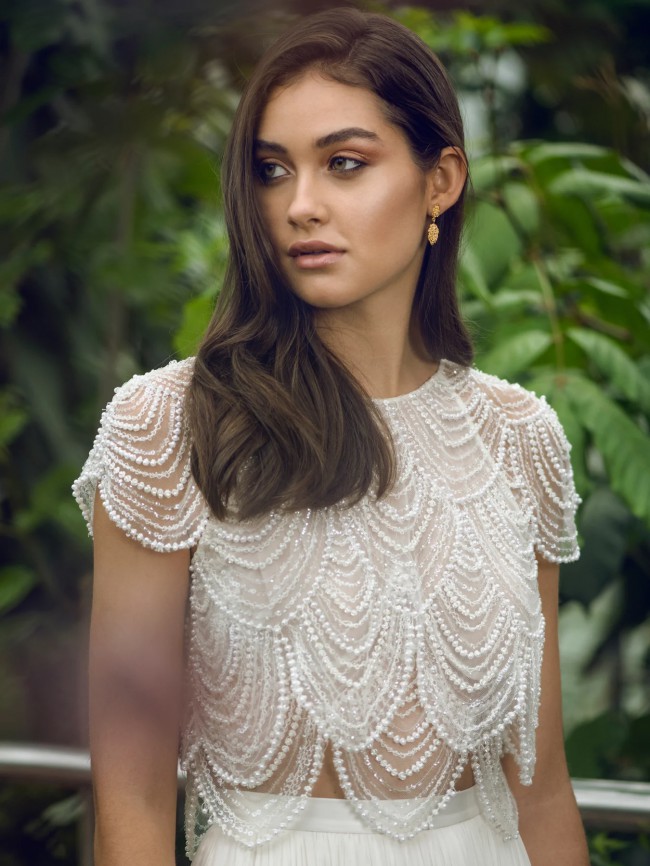 Layers of glistening pearl beads decorate the Monique Top creating a flapper-style top that shimmers in the light. Lined with sheer silk chiffon, Monique has a hint of sensuality.