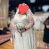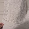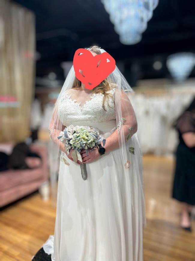 I ended up not using this dress. It is new and never altered. Beautiful floral lace sleeveless top with a cathedral train. Fabric is beautiful and flowy. Very flattering and shoes off waist really well.