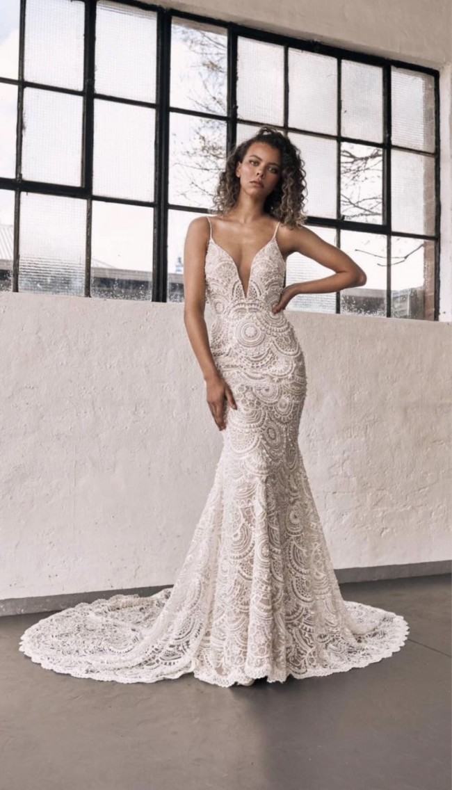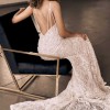 A gorgeous beaded mermaid gown featuring a stunning low back detail.