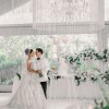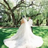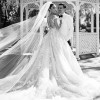 Magnificent, intricate lace embellishes the bodice and Organza skirt of this breathtaking ballgown featuring beaded lace detailing over an illusion neckline. The low sheer back with button closure and striking chapel train add the finishing touches.