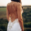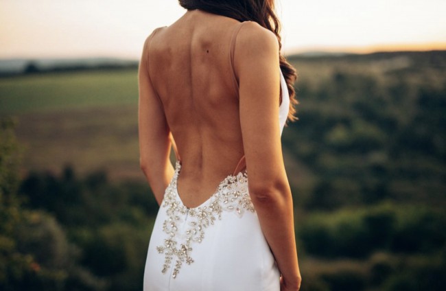 The dress is elegantly sexy and very comfortable, suitable for an all-night-long party. The back is fully opened. It is a minimalistic dress, spiced with crystals, beads and embroidery on the waistline.