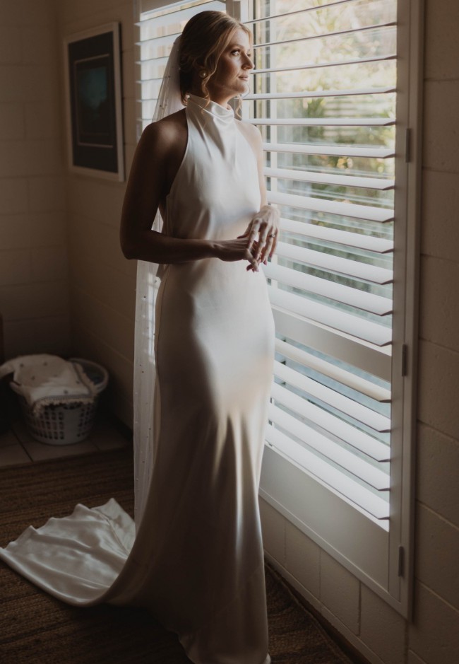 This gown was stunning and I felt like the most beautiful version of ‘me’ in it. It is ethically produced and custom made in the USA. 100% silk in a creamy off-white (was not a labelled with a colour by the designer). Fully lined. These gowns are made-to-order but in standard sizes (alterations required independently) - fortunately I didn’t require alterations to the fit at all. The only changes made were a slight hem raise and the addition of a finger loop.