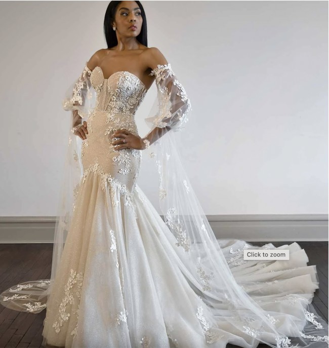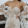 For the high-fashion bride looking for a bold, couture wedding dress, LE1135 is simply a show-stopper. The ultra-modern silhouette features a defined bustline and expertly-placed boning for a sexy, feminine feel. The sleek silhouette highlights the body’s natural curves. Floral lace appliques with 3D texture cascade from the bodice, down the body, all the way to the full trumpet skirt. The color options make this gown exquisitely versatile; the beige fabric brings a modern, sexy twist to the traditional bridal look, while the white fabric brings classic bridal glam. The optional long sleeves take this sleek look to the next level, with billowing sleeves covered in delicate, sparkling floral appliques.