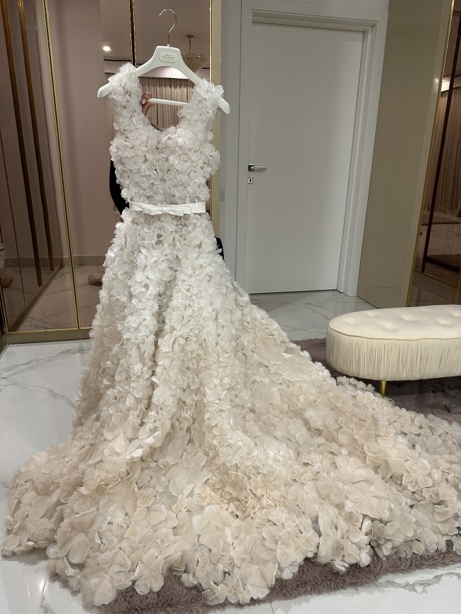 Atelier Pronovias Haute Couture dress. It was created "made to order" specially for me, in London, on Bond Street. The retail price was 19.000£. It comes with a special certificate that demonstrates that its haute couture design. I will send a long 2.5m veil with it. It can be worn like in the picture or as a ball gown because it has a petticoat that comes with it. All the flowers were sewn handmade. Its a very special wedding dress in an ivory color that goes in a blush pink at the ends of it. I am willing to lower the price for any bride that really wants to buy it. If you need more photos just let me know:)