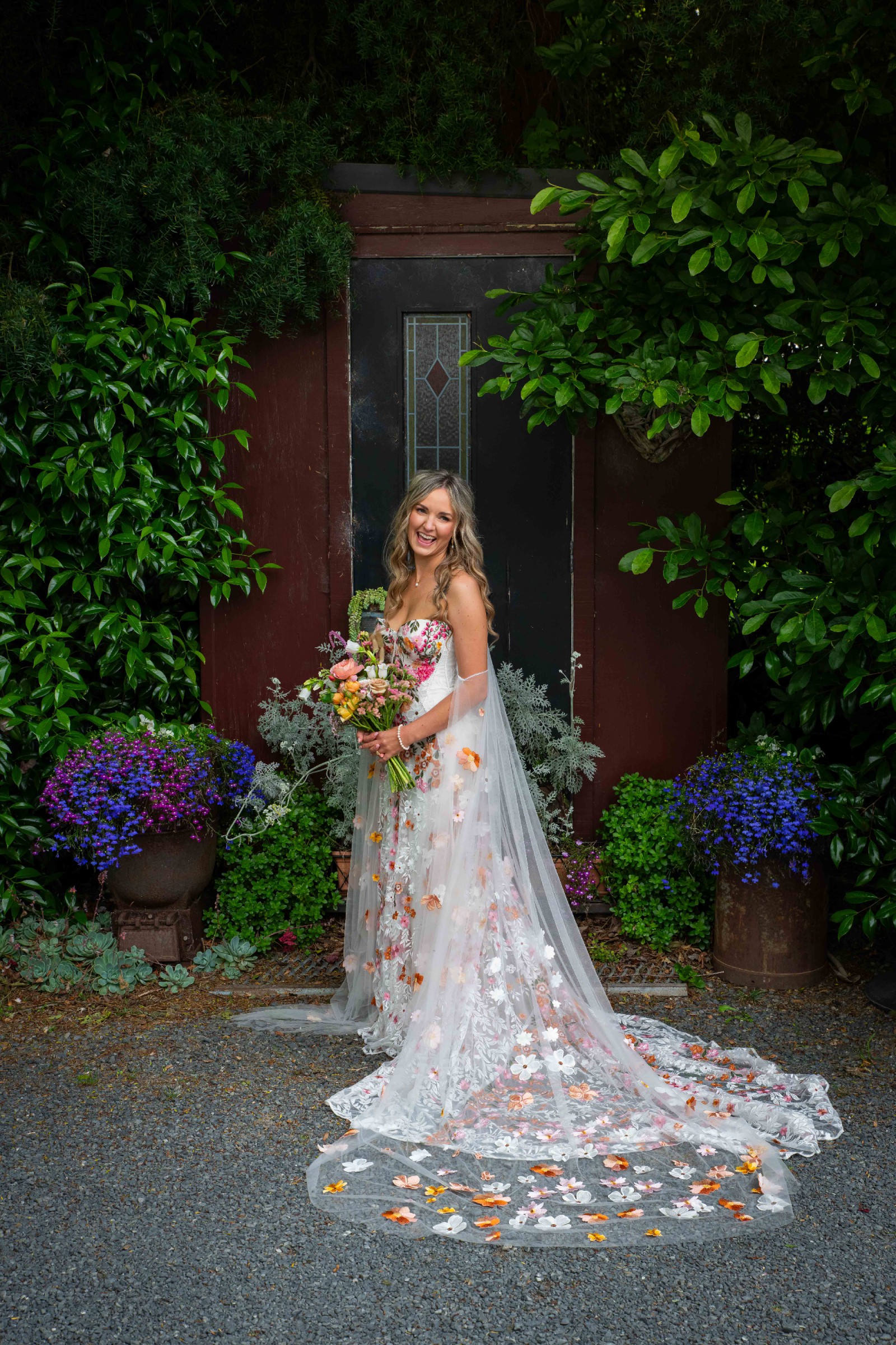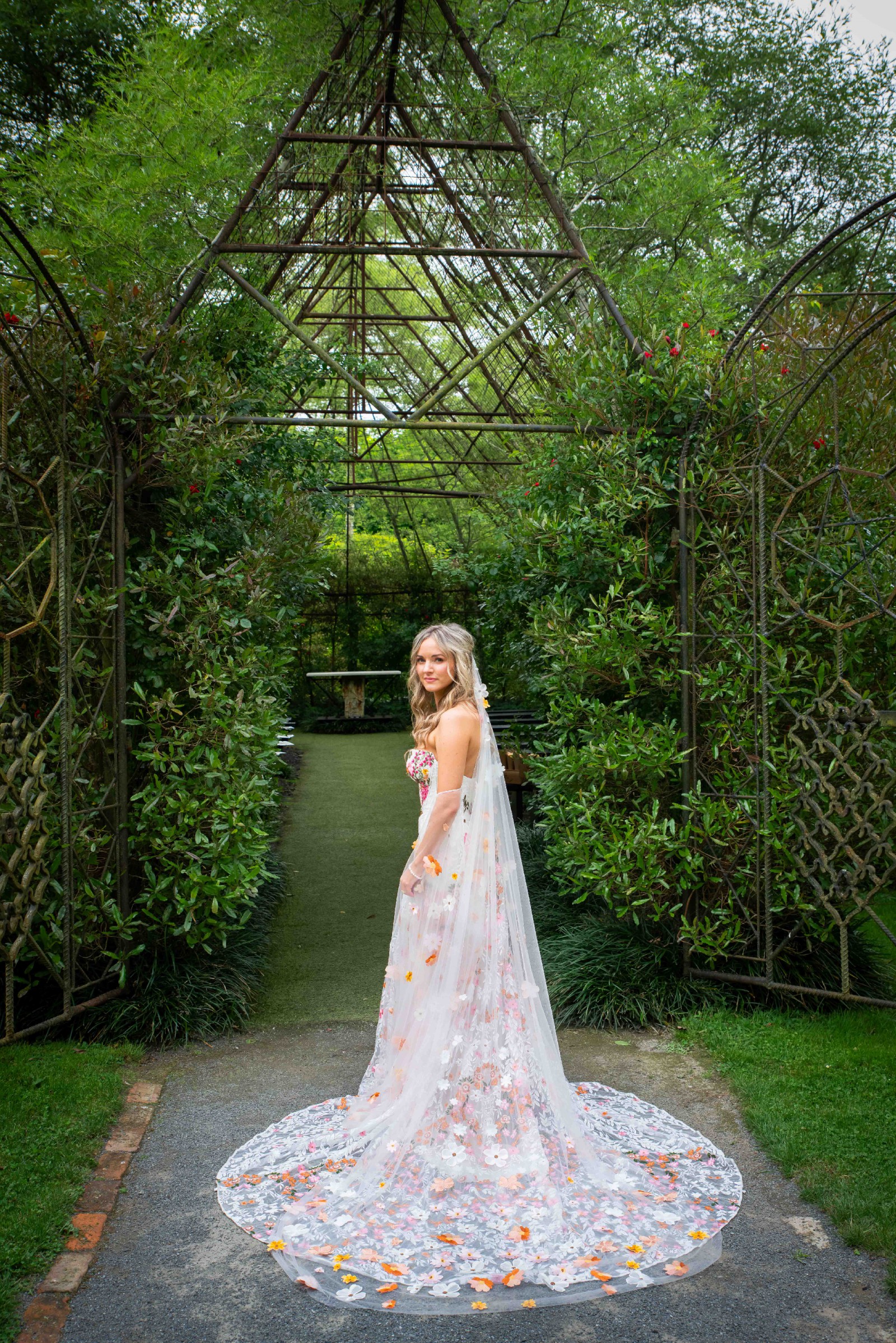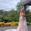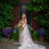 Inspired by desert blossoms in spring, Cora’s fully embroidered, vibrant florals are set on sand-dyed tulle to amplify the beautiful contrast of blooms throughout a bare terrain. A fully boned bodice wraps the body for ultimate support, balanced by a dramatic train with cascading embroidered florals.