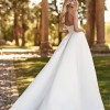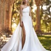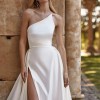 A confident and stylish satin wedding gown by Pronovias with a minimalist, asymmetrical bodice which gives the illusion of being one shouldered, when really, she is strapless! Over a full skirt featuring an ultra-high split. Gently fitted over the hips to create a clean silhouette before flaring into a full ball gown skirt.
