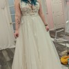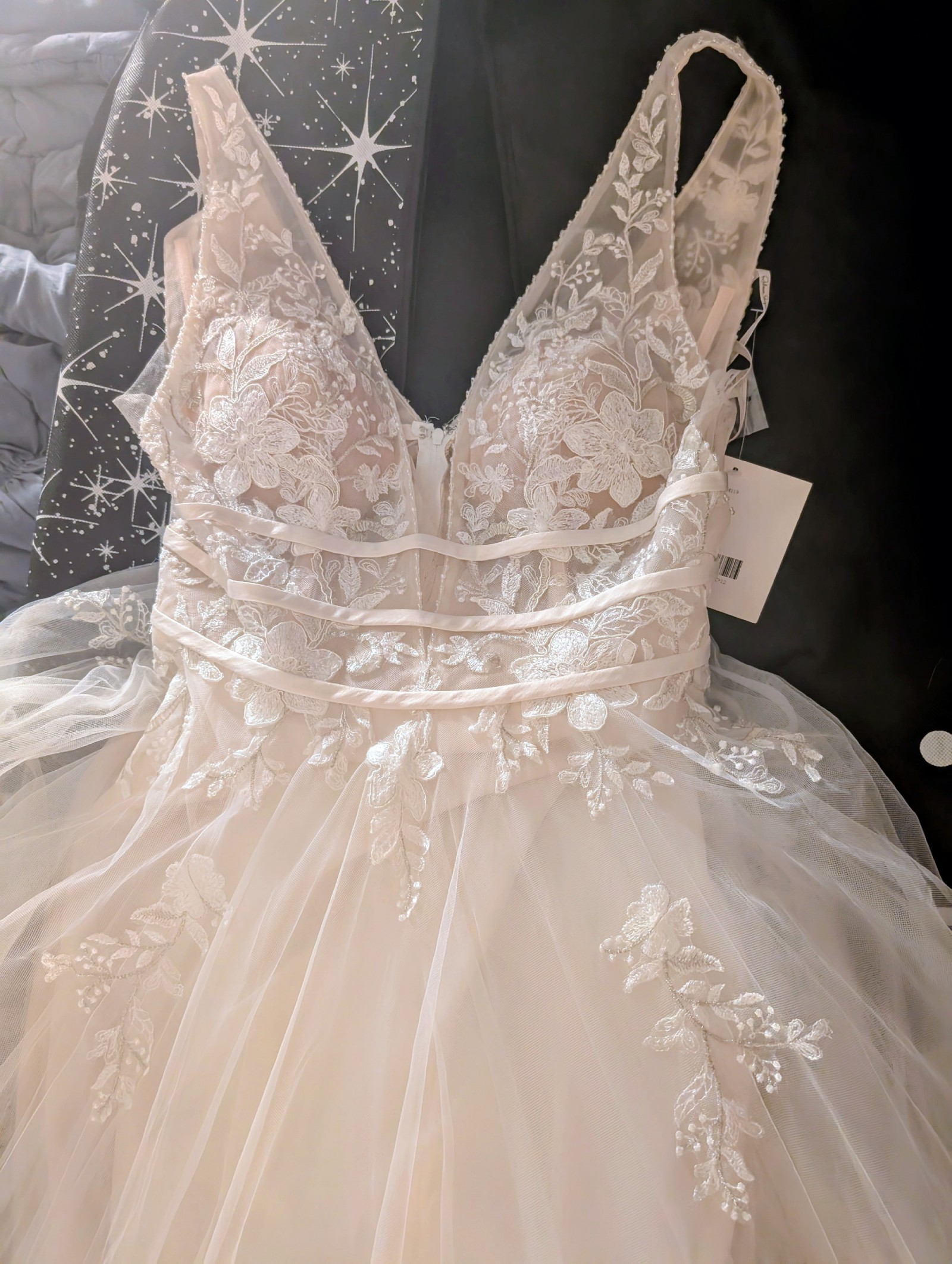 It's still in the bag I picked it up in, only unzipped it once, and then I fell in love with another dress! All pictures are of me in the sample, but the actual gown I'm selling is brand new, no alterations. Please don't hesitate to ask questions!