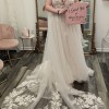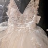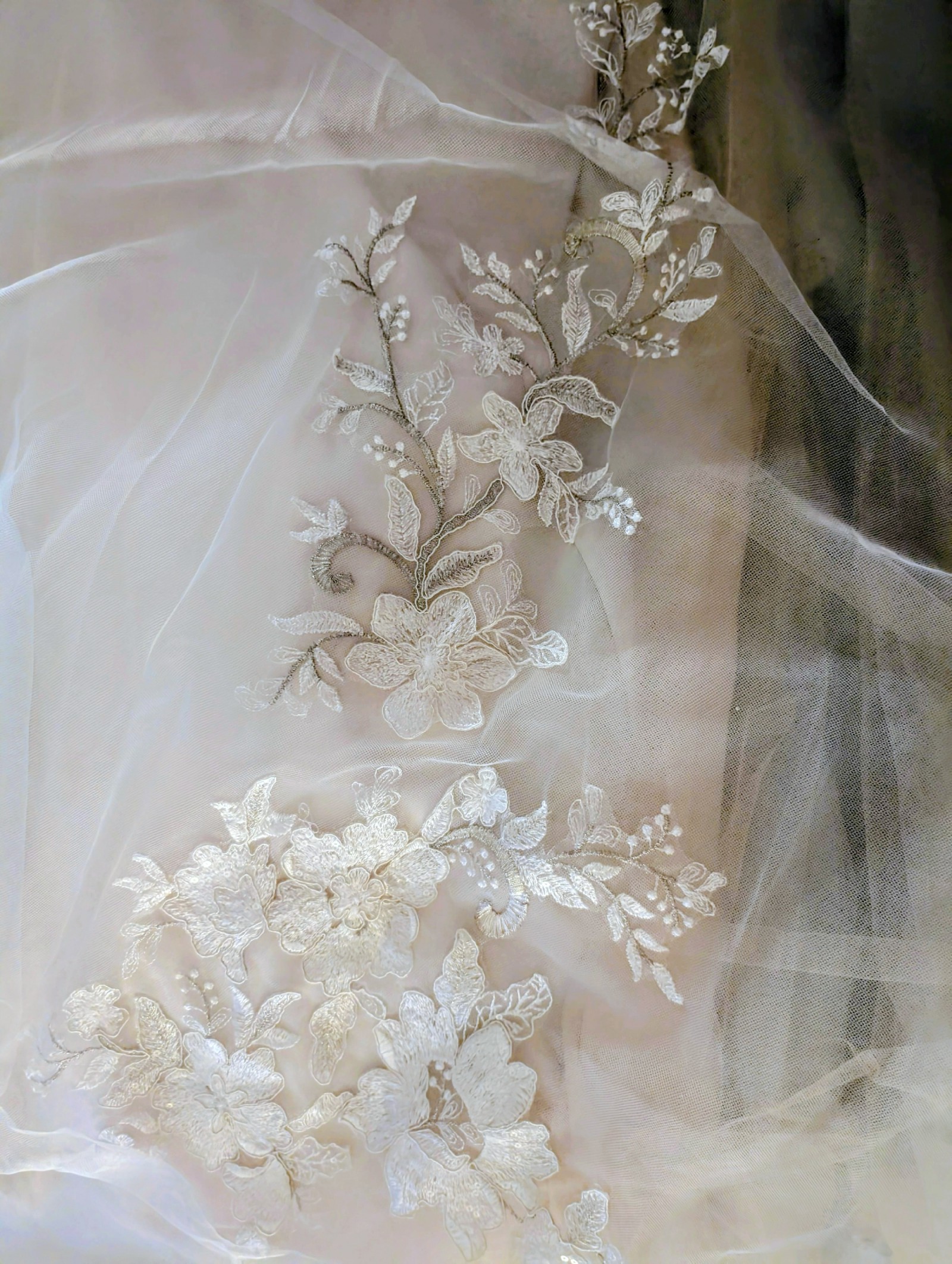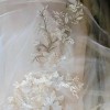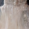 This exquisitely romantic A-line wedding dress features three bands wrapping around a lace bodice accented with beading, lining a plunging illusion V-neckline and V-back. Complete with illusion lace straps and lace motifs adorning a tulle skirt. Finished with covered buttons over zipper closure.
