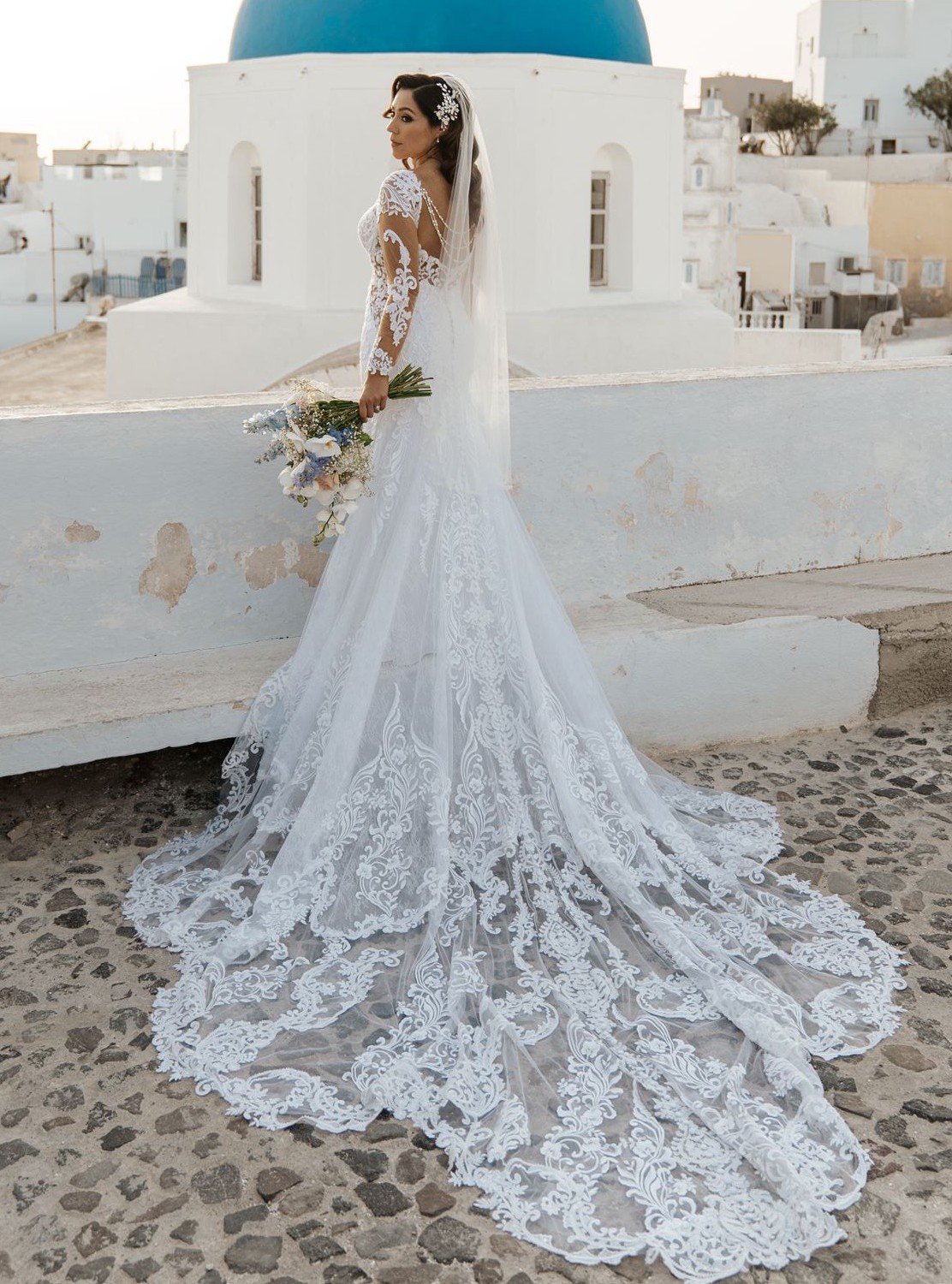 My dress is a Martina Liana style 1111 in white. . It has been altered with the measurements I gave. Gently used and in great condition, with a few small, hardly noticeable tears in the delicate mesh layer that doesn't affect its overall beauty. These minor imperfections can be easily repaired or left as is, as they’re not visible from a distance. Ideal for a bride looking for elegance at an affordable price. Since I first tried on this dress I knew it was the one! What makes it unique is that I added sleeves that were custom made, different then the ones that usually come with this dress. The dress is so dreamy with the most beautiful train, lace and beading. The cut and the way the lace lays on the dress especially around the waist gives the waist a very flattering look. It really made me feel like I had a tiny waist and I felt very sexy but classy in this fit and flare style dress. . . And the Train! 😍 . . Well The pictures and videos speak for themselves. . . I'm just In love! .