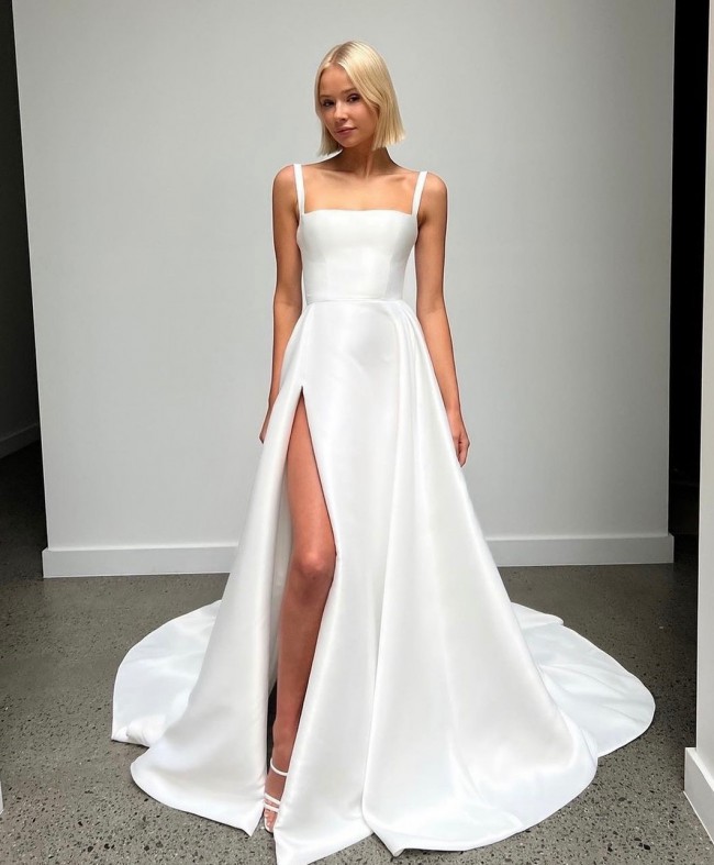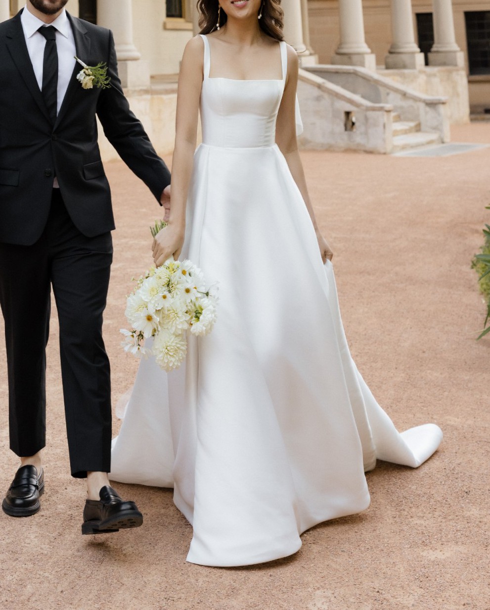 This wedding dress made me feel so beautiful and confident on my special day. The fitted corset gave me a flattering, slim silhouette while the structured, flowing skirt added volume and that little bit of drama. It was so comfortable, easy to get into, and supportive enough that no bra is needed.