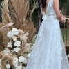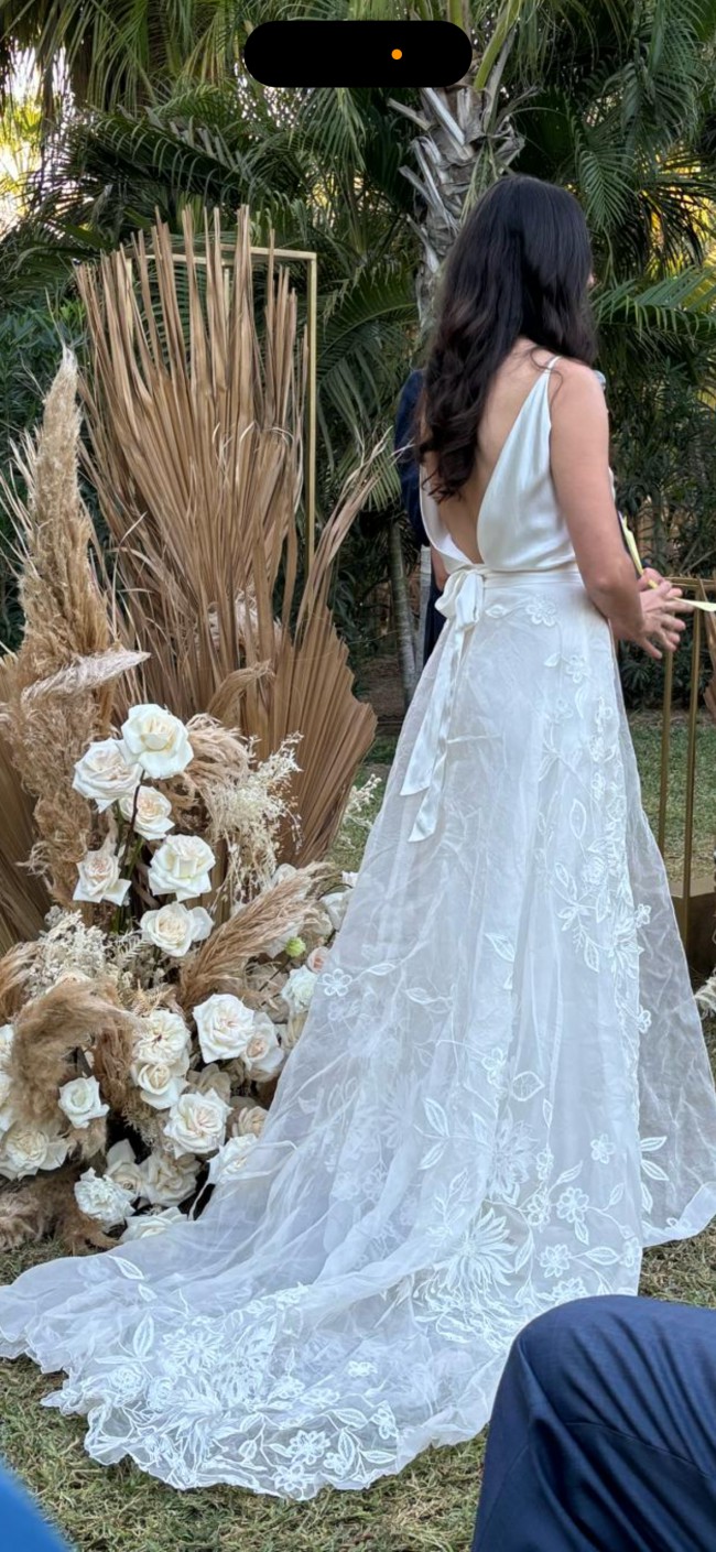 Stunning authentic A La Robe wrap skirt, designed to fit all sizes. Adorned with beautiful floral embroidery and luxurious silk ties, this wrap skirt is a great touch to any wedding dress. Perfect for creating unforgettable wedding photos or elevating your look at the alter before taking it off to party. It would look good with any white or cream dress. It has been worn only once and is in excellent condition with no stains or rips.