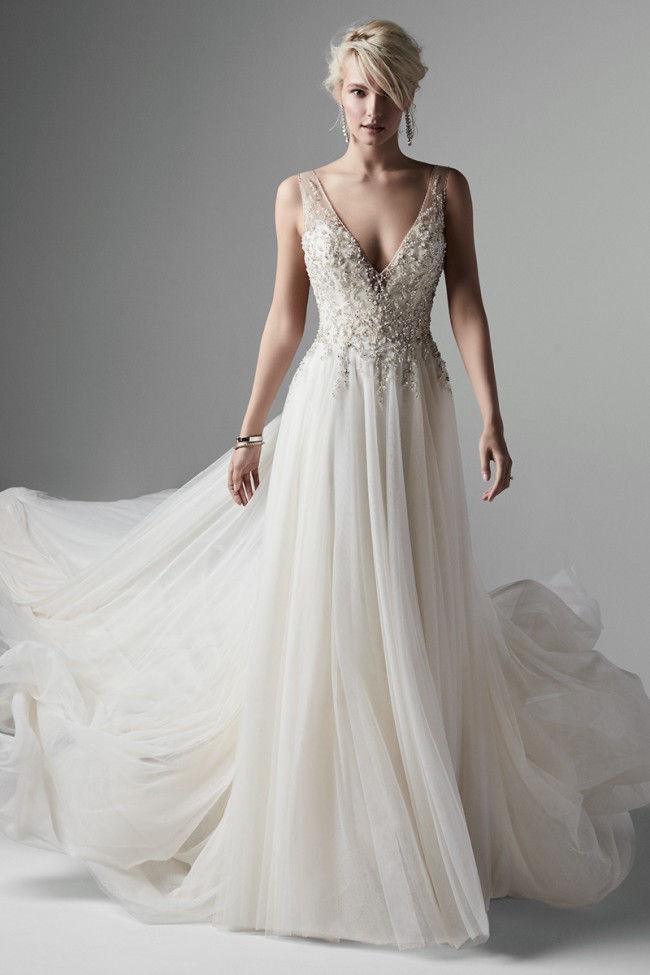 This Randolph wedding dress by Mon Cheri is a dream come true for any bride who desires a blend of elegance and romance on her special day. The exquisite cream tulle fabric cascades into a flattering A-line silhouette, allowing for effortless movement as you walk down the aisle. The sweetheart neckline beautifully frames your décolletage, while delicate straps add a touch of sophistication and support, creating a classic yet contemporary look.