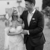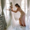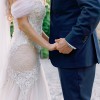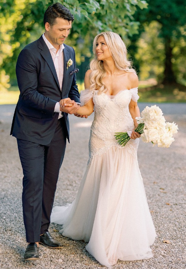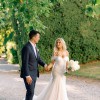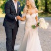 Custom designed wedding gown by Pallas Couture made from delicate silk tulle and French lace. This beautiful gown features a sweetheart neckline with hand-beaded lace applique and tulle detailing on the fitted drop-waist bodice flowing into a fishtail silhouette and stunning train.