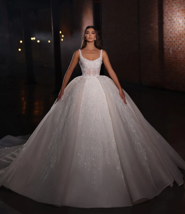 Crafted in a dreamy ivory hue, this floor-length gown is perfect for a timeless wedding aesthetic. The delicate straps provide just the right amount of security without compromising on style, allowing for ease of movement as you dance the night away. The full skirt beautifully flows, creating an ethereal effect that works seamlessly for both indoor and outdoor venues.