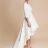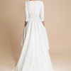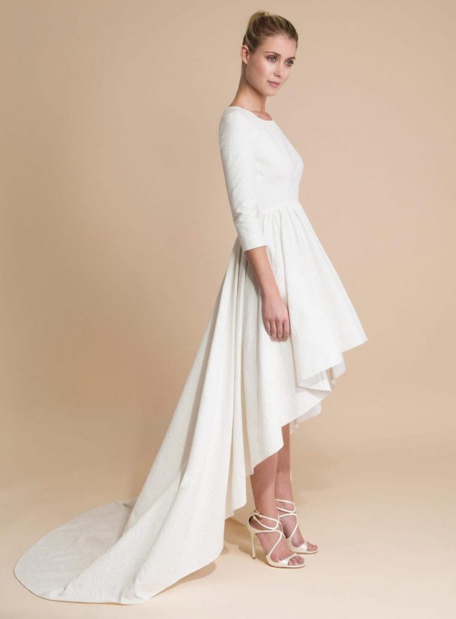 Parisian designer Delphine Manivet. Short bridal dress with long train. features pockets, a round neckline, ¾ sleeves and a long style train. Made of cotton jacquard and lined with silk pongee.