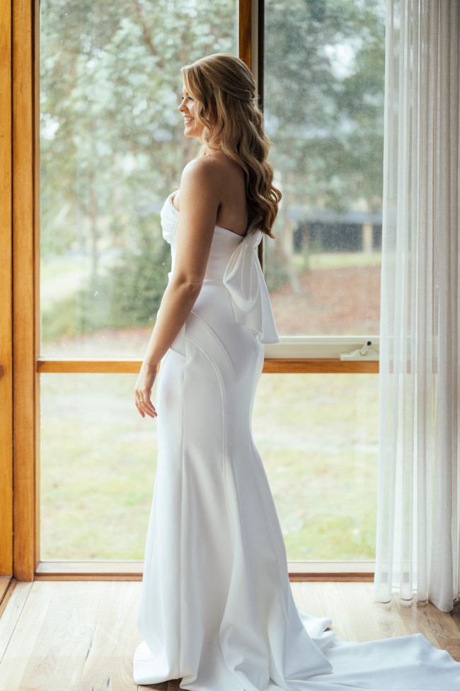 The 'Waldorf' gown features a structured inner bodice and asymmetrical lines, combined with a soft one-shouldered strap. The strap was customised and is designed to sit off the shoulder but can be placed higher if desired.