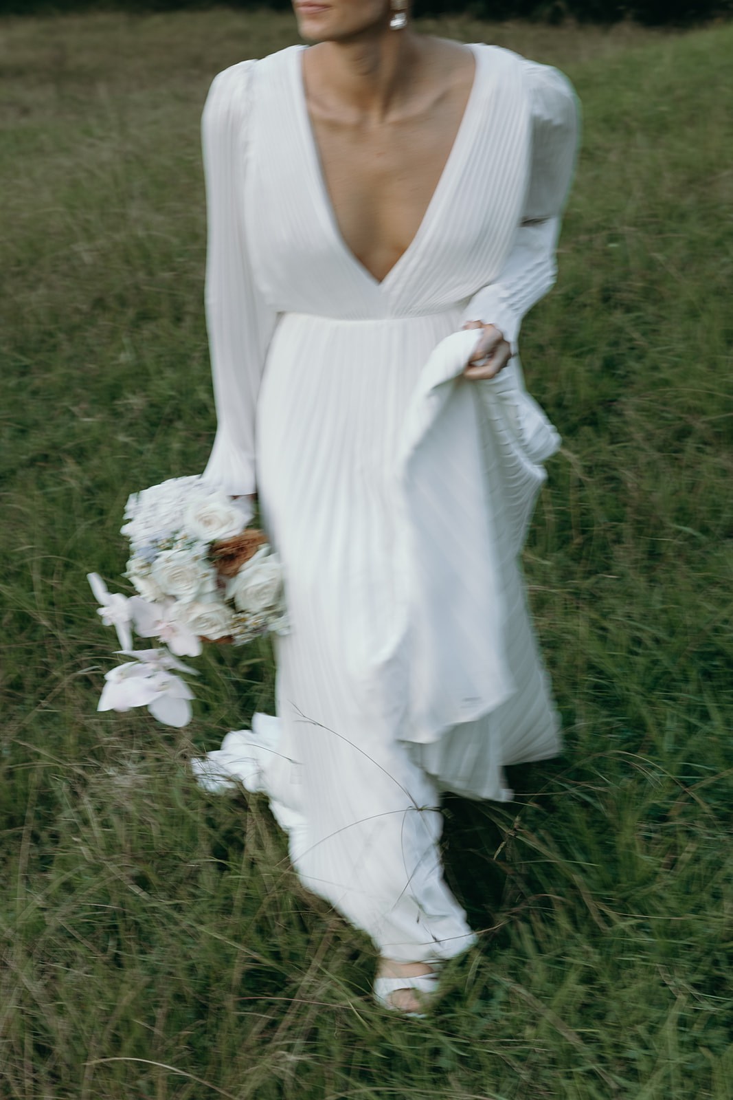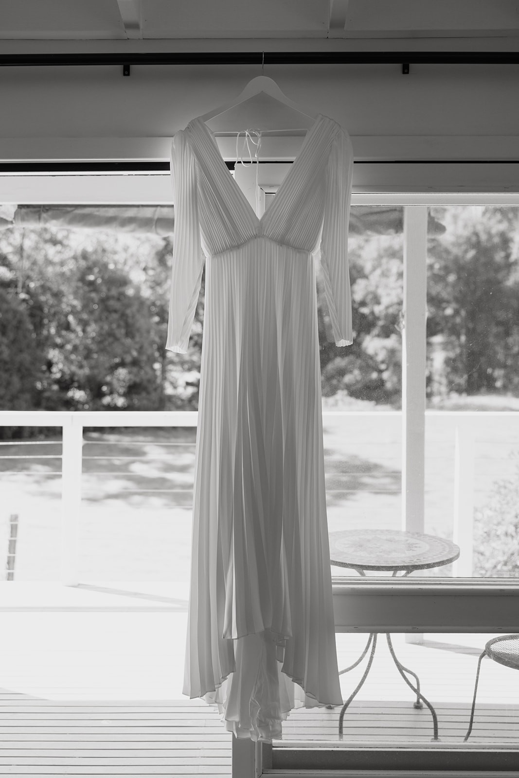 Minimalistic signature pleated satin dress. Featuring; finely detailed silhouette, gathered sleeves, open back with tie detail and an A-line skirt.