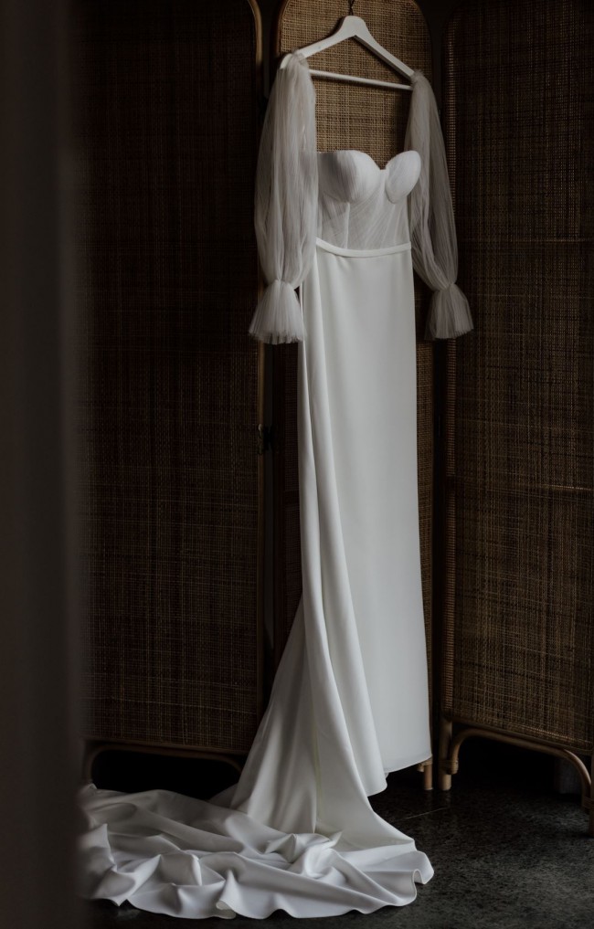 Her fitted, buttery crepe skirt beautifully hugs your curves, creating a flattering silhouette. Pippa's luxurious pleated tulle bodice adds just the right touch of texture and is perfectly paired with her separate puffy tulle sleeves. These sleeves offer the perfect amount of coverage and add a touch of whimsical charm, making them a true statement addition to this design.