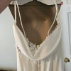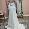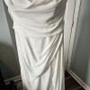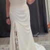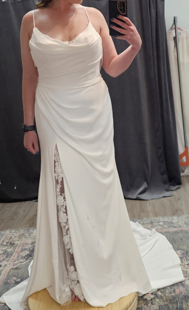 This dress has a gorgeous ruched bodice, with peek-a-boo lace detailing at the cowl neck line. Made with crepe material and a lace leg slit. The back has been altered so the swoop piece is removable, allowing the lace detailing to be on display. Professionally cleaned on March 5, 2025. Minimal alterations have been done. Small hook for simple bustle, no length has been taken off (it was custom ordered in extra long, so my tall brides, this is the one for you!).