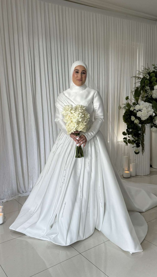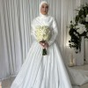 This stunning A-line wedding dress is the embodiment of elegance and grace. Crafted from luxurious satin, it drapes beautifully, creating a flattering silhouette that flows seamlessly with every step. The high neck and long sleeves add a touch of sophistication, making it perfect for any season. The intricate beading, sparkling crystals, and delicate pearls adorn the gown, giving it a timeless charm and a hint of whimsy.
