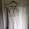This is a gorgeous 3d lace with plunging neckline, flattering low back, and comes with a detail belt. It is size 12. I normally wear a 10 and if anything it is a bit tight.