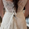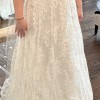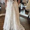 This enchanting A-line wedding dress by Legends Romona Keveza is designed in a luxurious ivory lace, featuring intricate embroidery that adds a touch of artistry and elegance, capturing the light beautifully as you move.