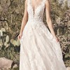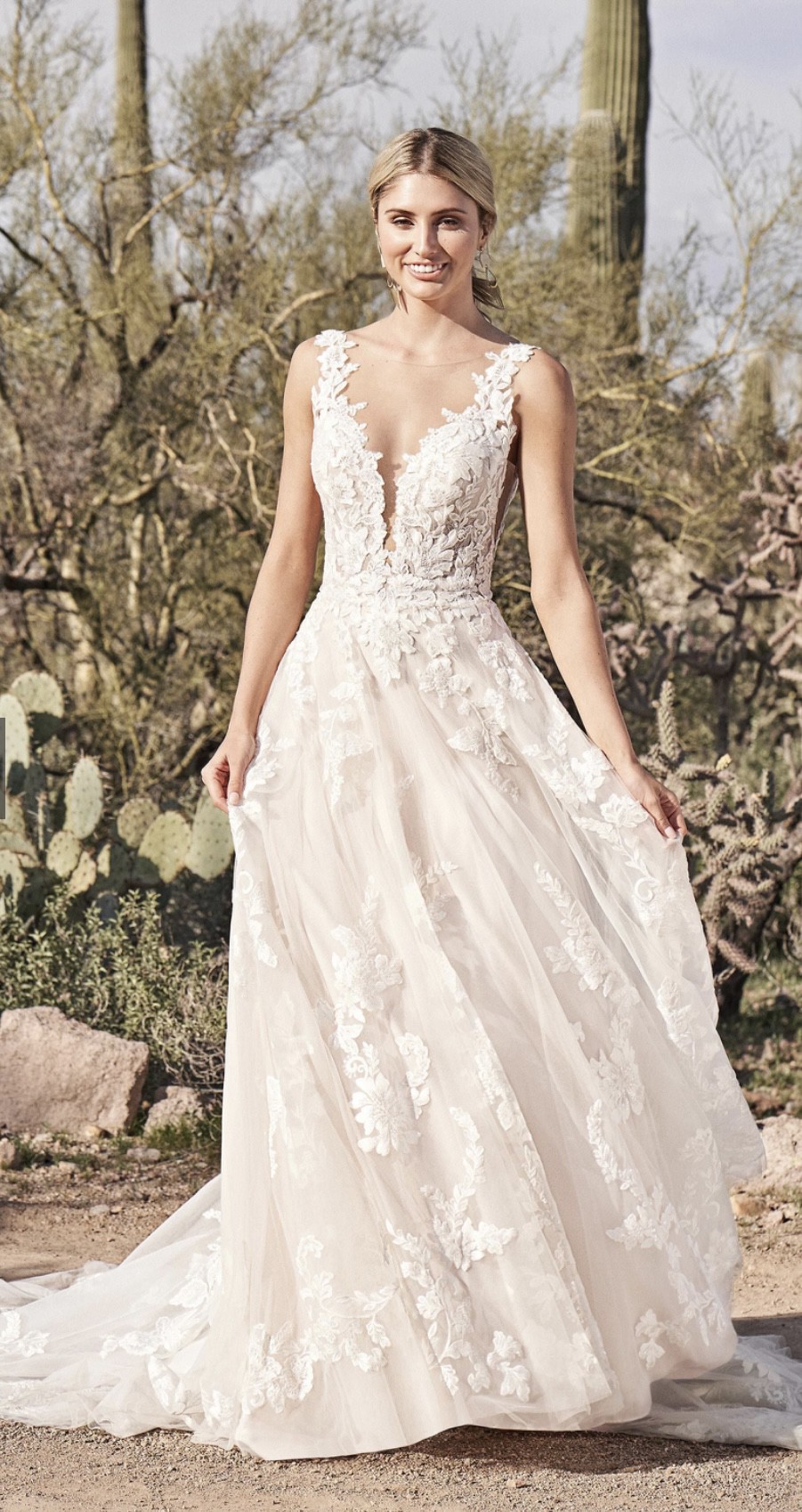 Soft, romantic lace details this tulle A-line wedding gown. Featuring an illusion Sabrina neckline with a plunge, side cutouts, and sexy scoop back. A Chantilly lace underlay in the bodice blends with sequined embroidered appliqués that gracefully cascade throughout the skirt and train. Hidden tulle pockets in the skirt are the finishing touch.