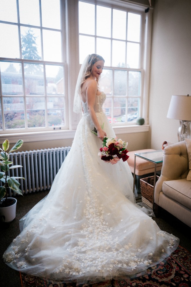 - Bottom of the dress has been hemmed to match my height, all embroidery was moved up by hand to keep the original look! There's also a bustle that was added on the back to lift the dress up and loop it onto buttons for dancing :)