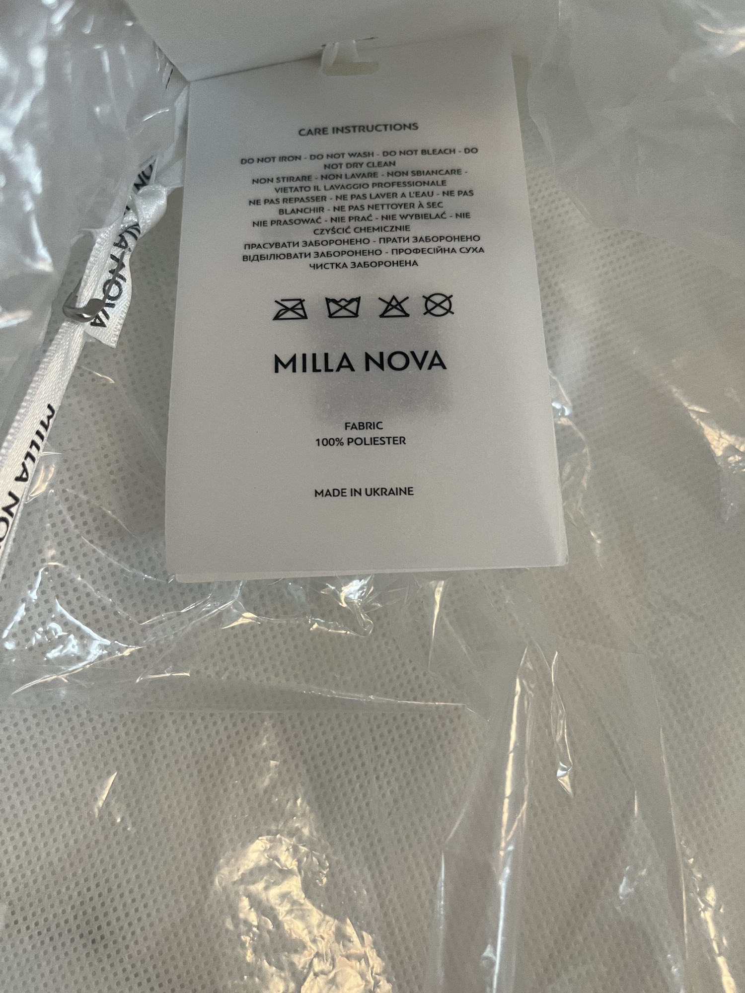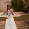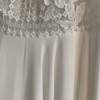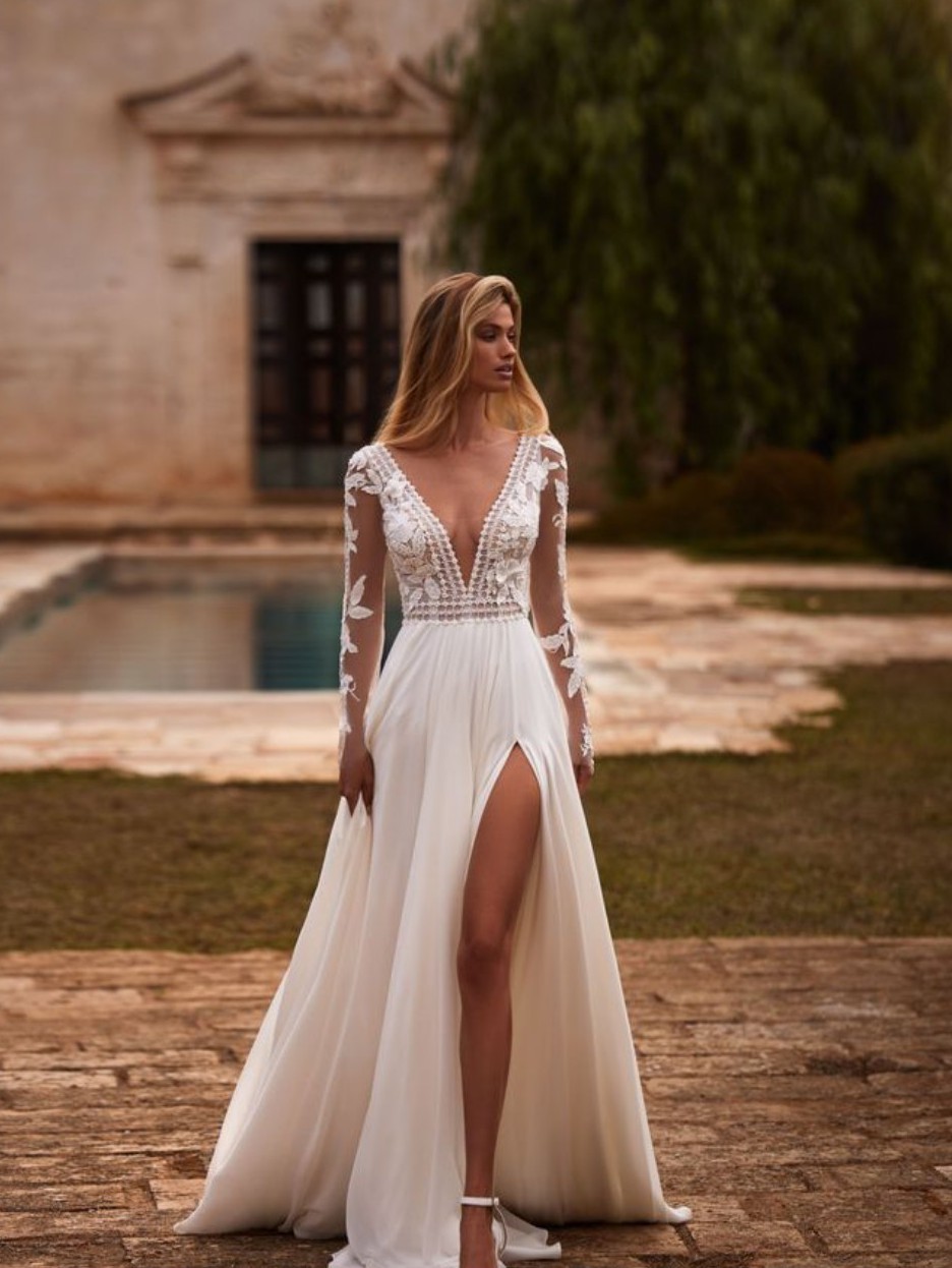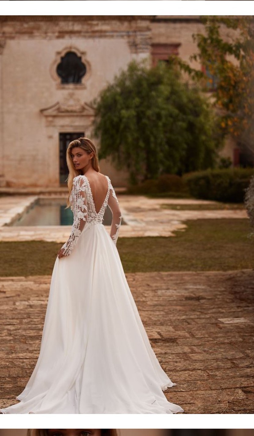 Boho-style A-line wedding gown delicately adorned with floral lace appliques. Featuring a plunging illusion V-neckline, and a boned bodice embellished with dreamy floral apliqués that bloom elegantly onto the sheer long sleeves. The gown boasts a deep open V-back and a flowy princess skirt and an alluring thigh slit. New, never worn. . Would probably work for people size 10-14 in regular sizes.