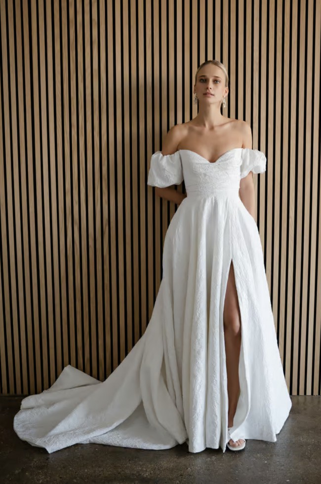 The Beau gown is a true romantic. Cut in our intricately textured beveled floral jacquard fabric, her dramatic silhouette is effortlessly airy. The sculpted bodice is endlessly flattering, and the detachable sleeves offer incredible versatility.