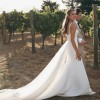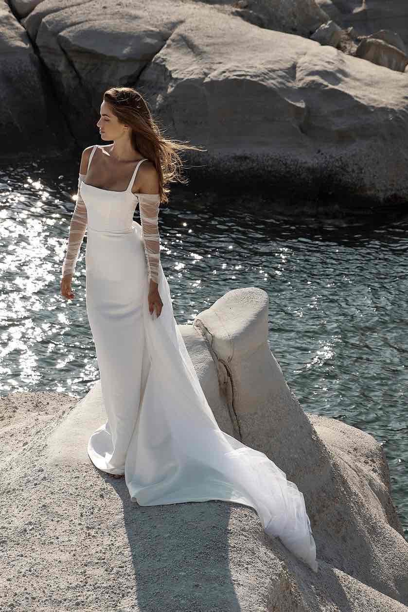 Category is modern 60s icon. You win in Arta, thanks to tulle details over a luxe duchess satin structured silhouette. A square neckline, fitted bodice with delicate straps and gentle fit and flare skirt contrasts perfectly to the softness of tulle sleeves and narrow tulle overskirt, both which are detachable.