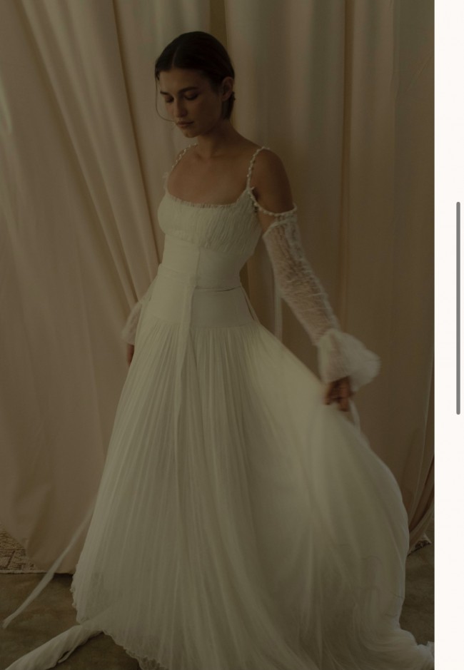 Pin-tucked lace empire gown with drop waist. The Elizabeth features broomstick pleated silk tulle and lace with fresh water pearls straps. The Elizabeth pairs beautifully with our lace pin-tucked gloves. I absolutely loved this dress. I wore it for about 4 hrs at my wedding before changing into the second look. I felt absolutely stunning in this dress and it was the perfectly lightweight and effortless. She has been professionally cleaned and is ready to find her new bride. Sleeves, neck scarf, belt and veil included. *Sold as a set*