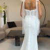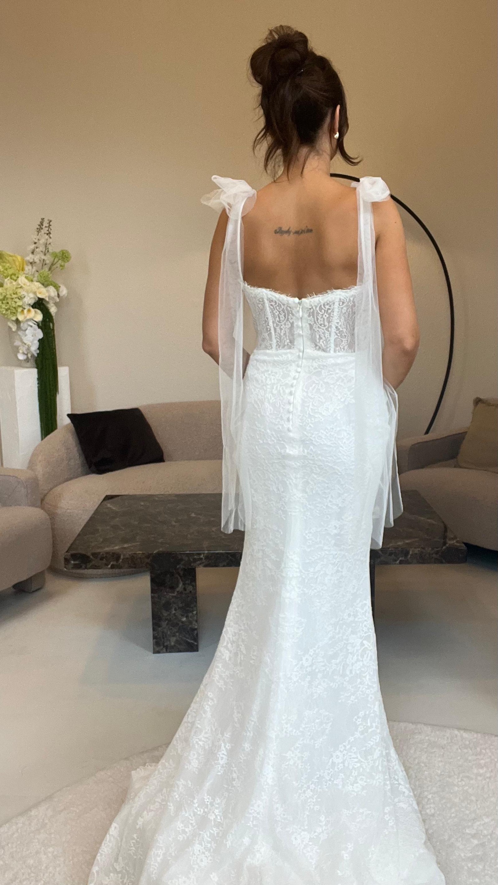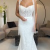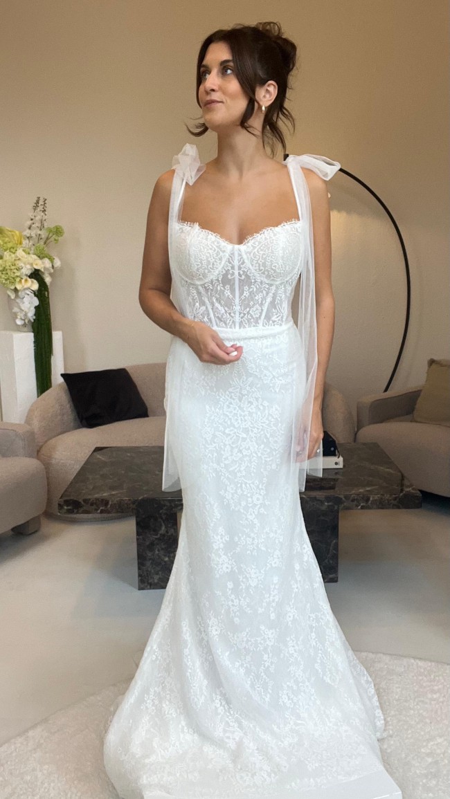 Featuring a never-before-seen Chantilly lace and corset-like bodice with exposed boning and delicate eyelash lace detail framing the bust, Crawford will have you feeling like a supermodel on your most special day.