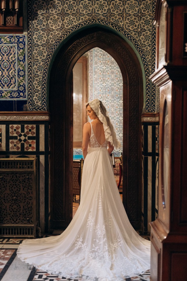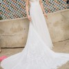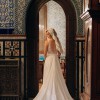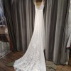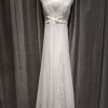 Beautiful flowy, romantic dress perfect for an outdoor or indoor wedding. Beautiful embroidery details in the bust wrap around the back. V plunge in the front and low back. Stunning train with detail. Bustle easily buttons in the back when you are ready to dance. Wore with an heirloom lace veil. So many compliments and such a fun dress, felt like a goddess.
