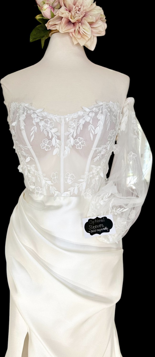 Twyla by Rebecca Ingram is a beautiful Elodie Mikado dress. *The strapless cat eye neckline is enhanced with sheer organza-lined bodice and beaded 3-D lace motifs with exposed boning detail. *Detachable off-the-shoulder long illusion balloon sleeves are sold separately.