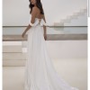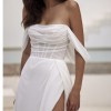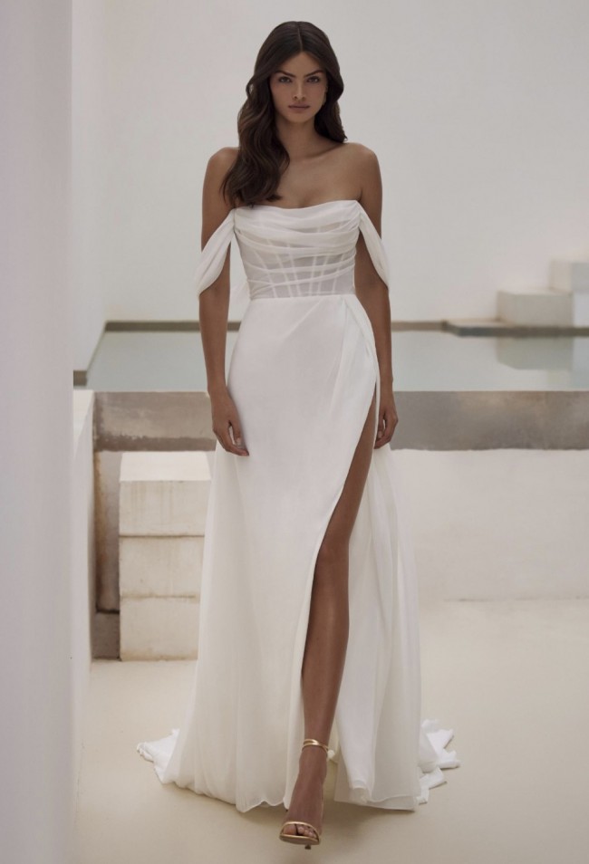 Graceful chiffon gown with a semi-transparent boned off-the-shoulder corset, sheer tulle sleeves, and lace-up closure on the back. A straight-silhouette maxi skirt features a straight side slit and a delicate train.