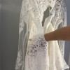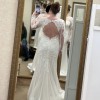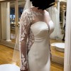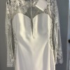 Pronovias Bacall is a glamorous crepe gown featuring an illusion bodice with long sleeves + an open back! The train is just breathtaking. Striking lace details decorate this silhouette for an alluring look. This dress is definitely a unique statement.