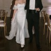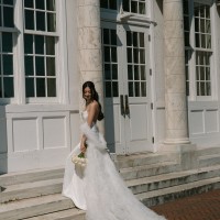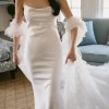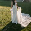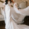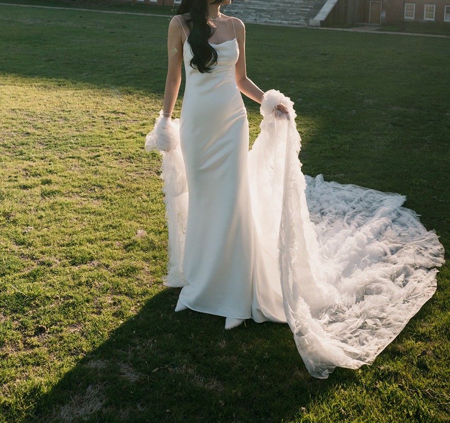 Chic, modern, and effortlessly elegant – the Moss gown by Sarah Seven is a timeless silhouette that flatters in all the right places. Crafted from smooth, luxurious ivory satin, it features a square neckline, clean lines, and a slim train, striking the perfect balance between understated sophistication and subtle drama. Its minimalist design allows the bride to shine while remaining comfortable and confident throughout the day.