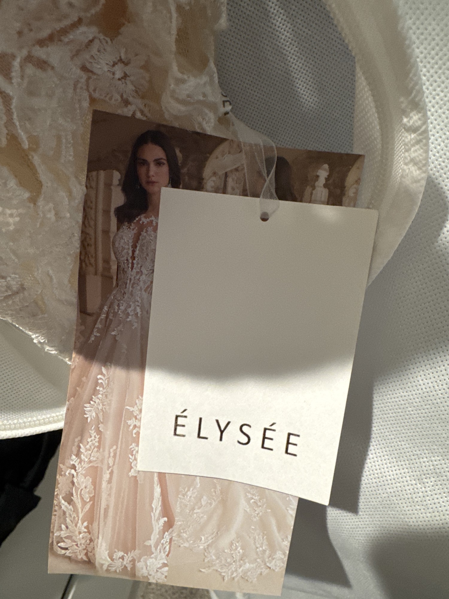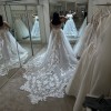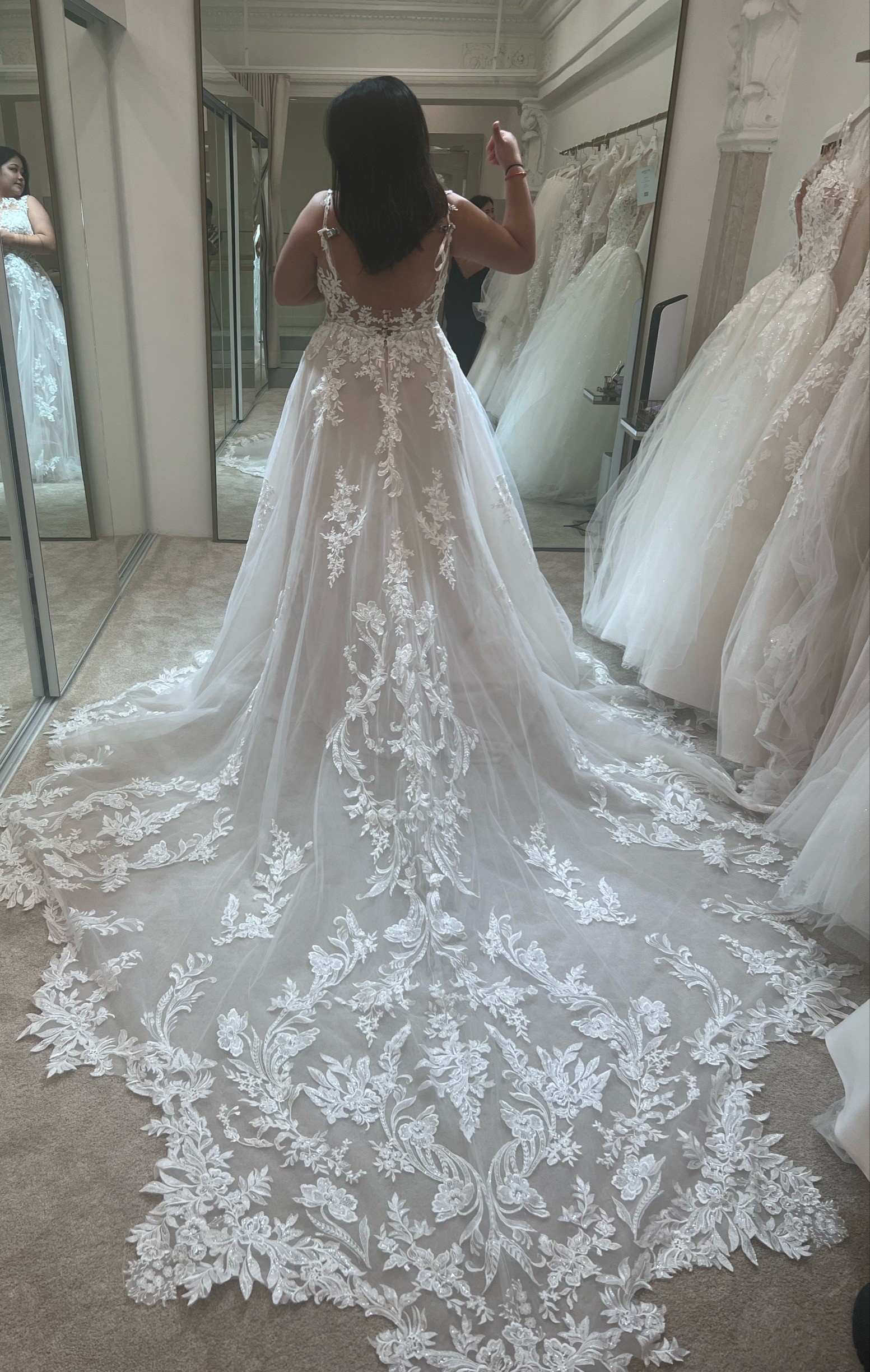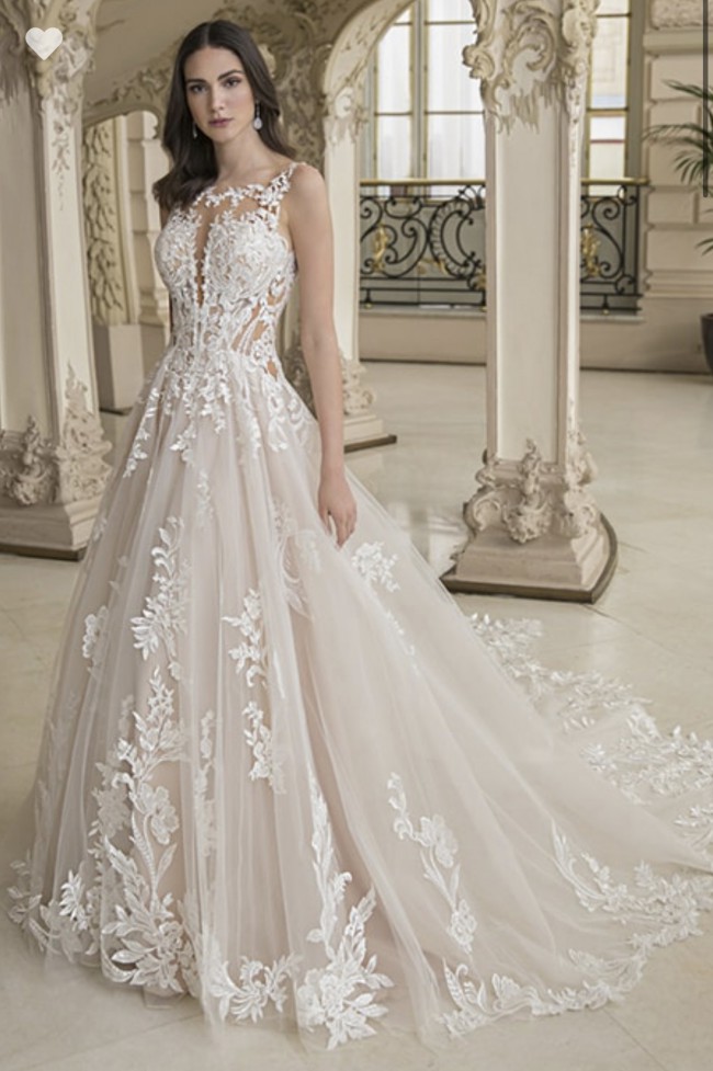 The dress is a ballgown style, with a fitted bodice and a full, flowing skirt. Delicate, floral lace appliqués adorn the bodice and skirt of the dress. The neckline is a sweetheart shape, and the sleeves are sleeveless.