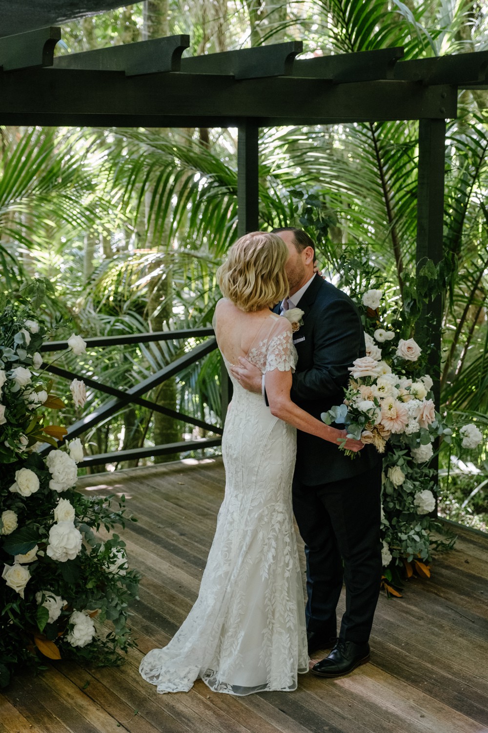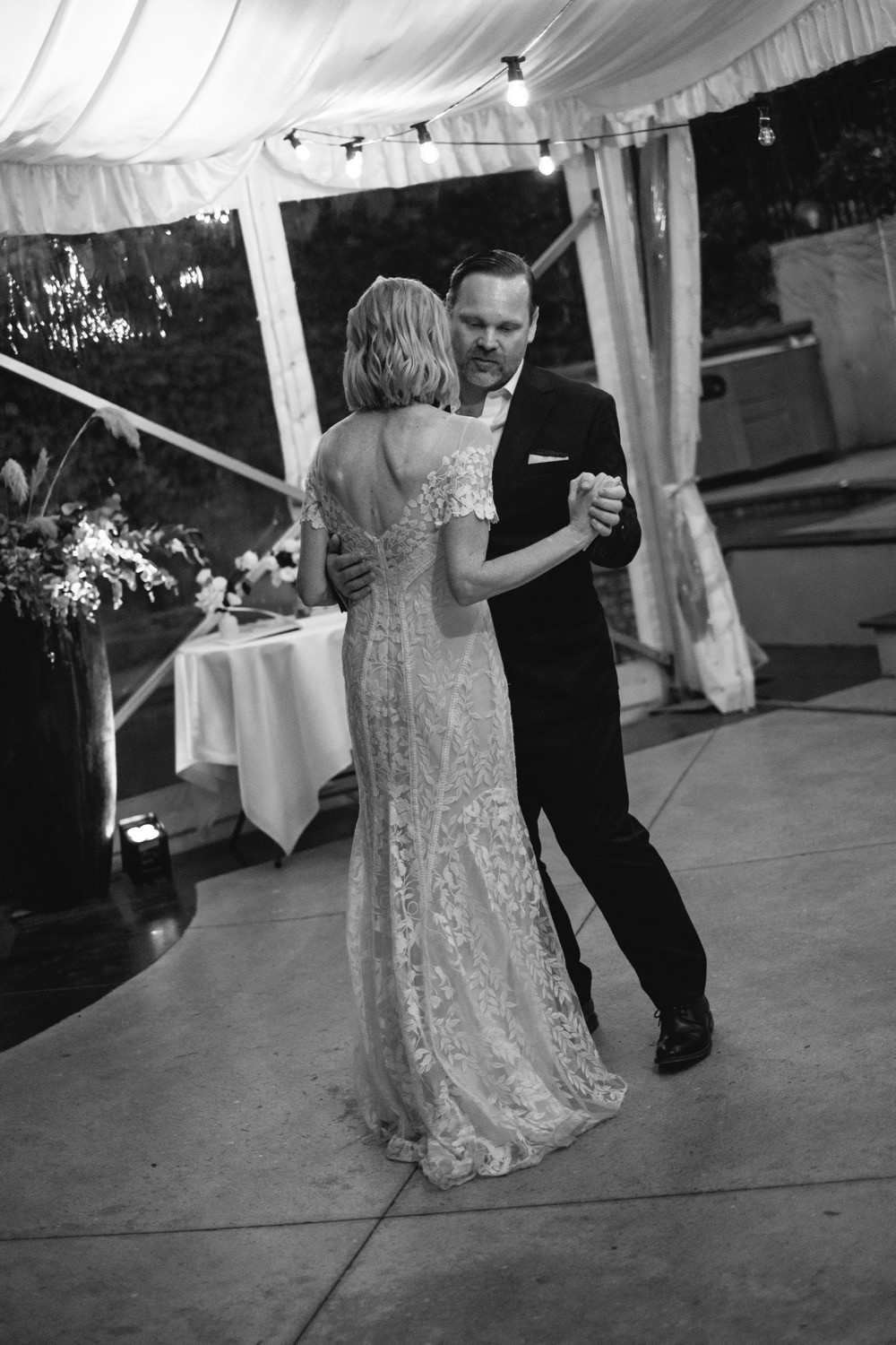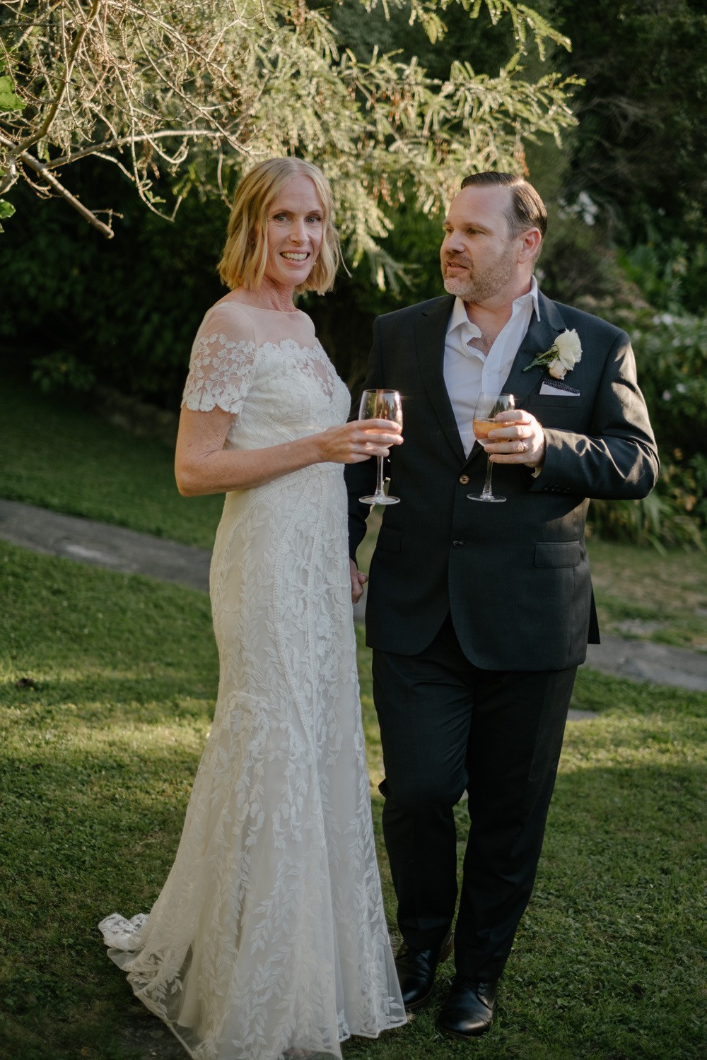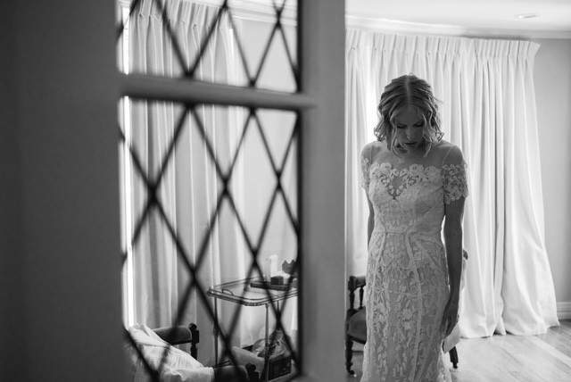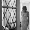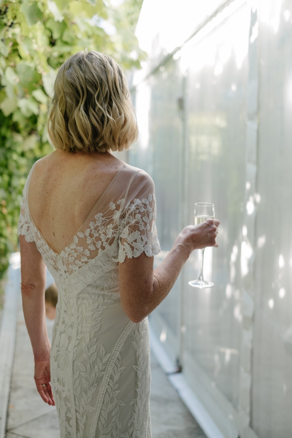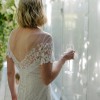 The low open back adds quiet drama, while the champagne tulle underlay gives the ivory lace a warm, luminous glow.