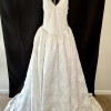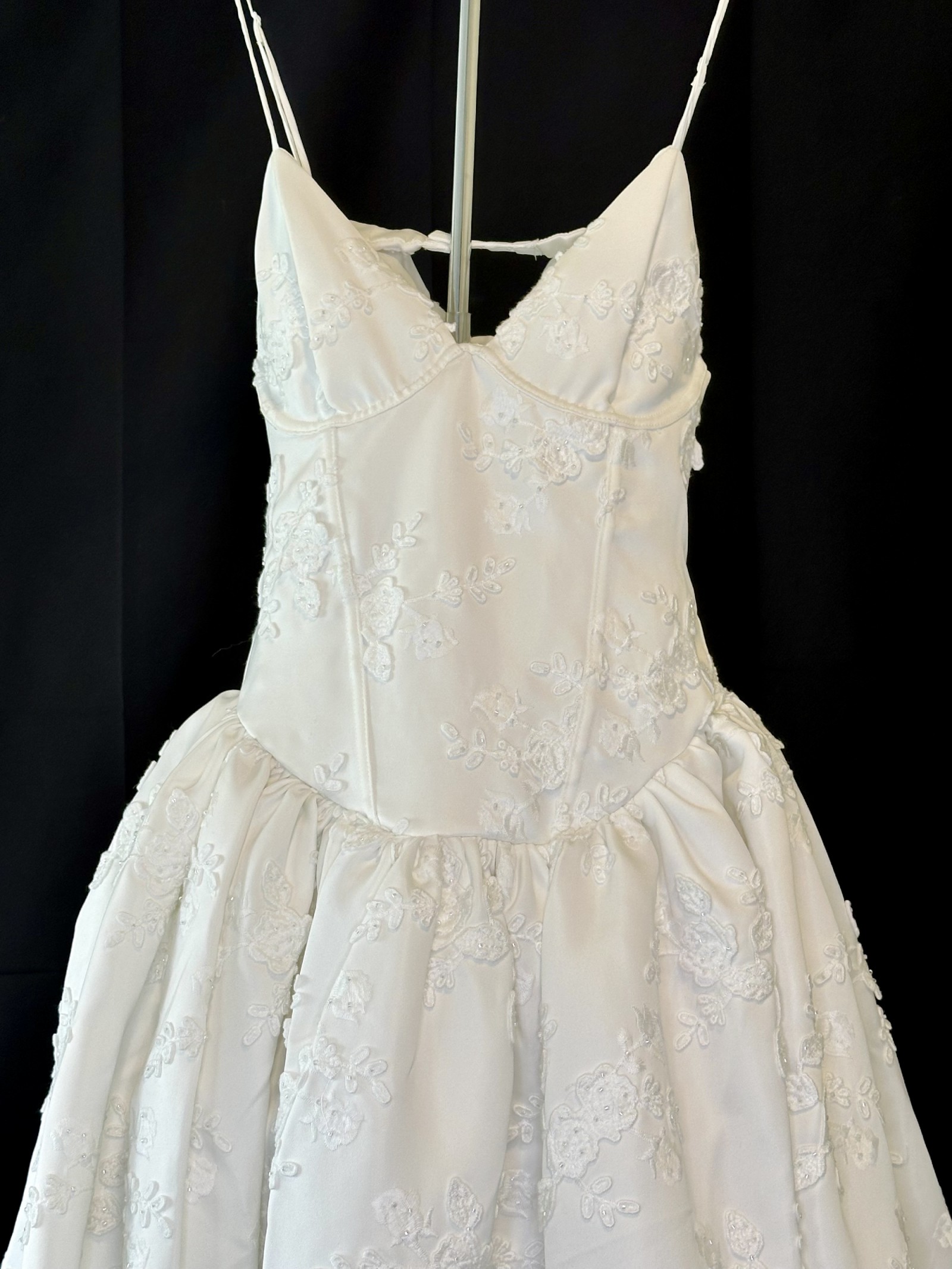 Embroidered satin wedding dress with triangle cups, a corset-style bodice with boning, and an open back adorned with stacked satin bridal buttons. It's finished with a fully gathered skirt with stiff tulle gathered between the lining and skirt fabric for volume at the waist, plus a long train at the back.