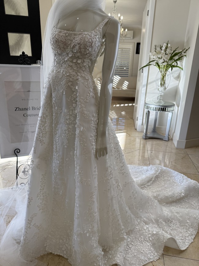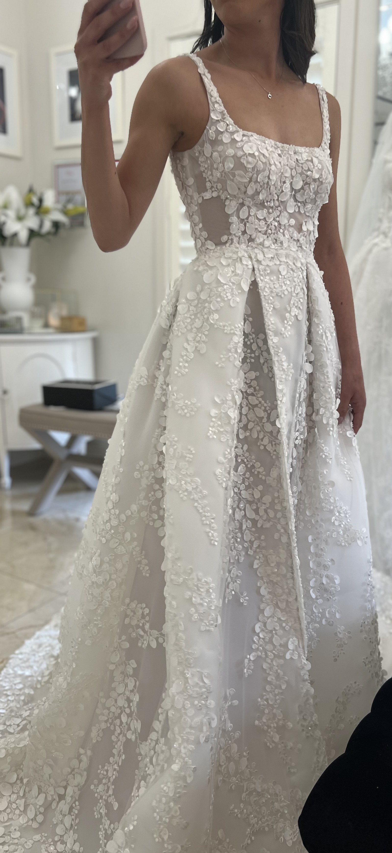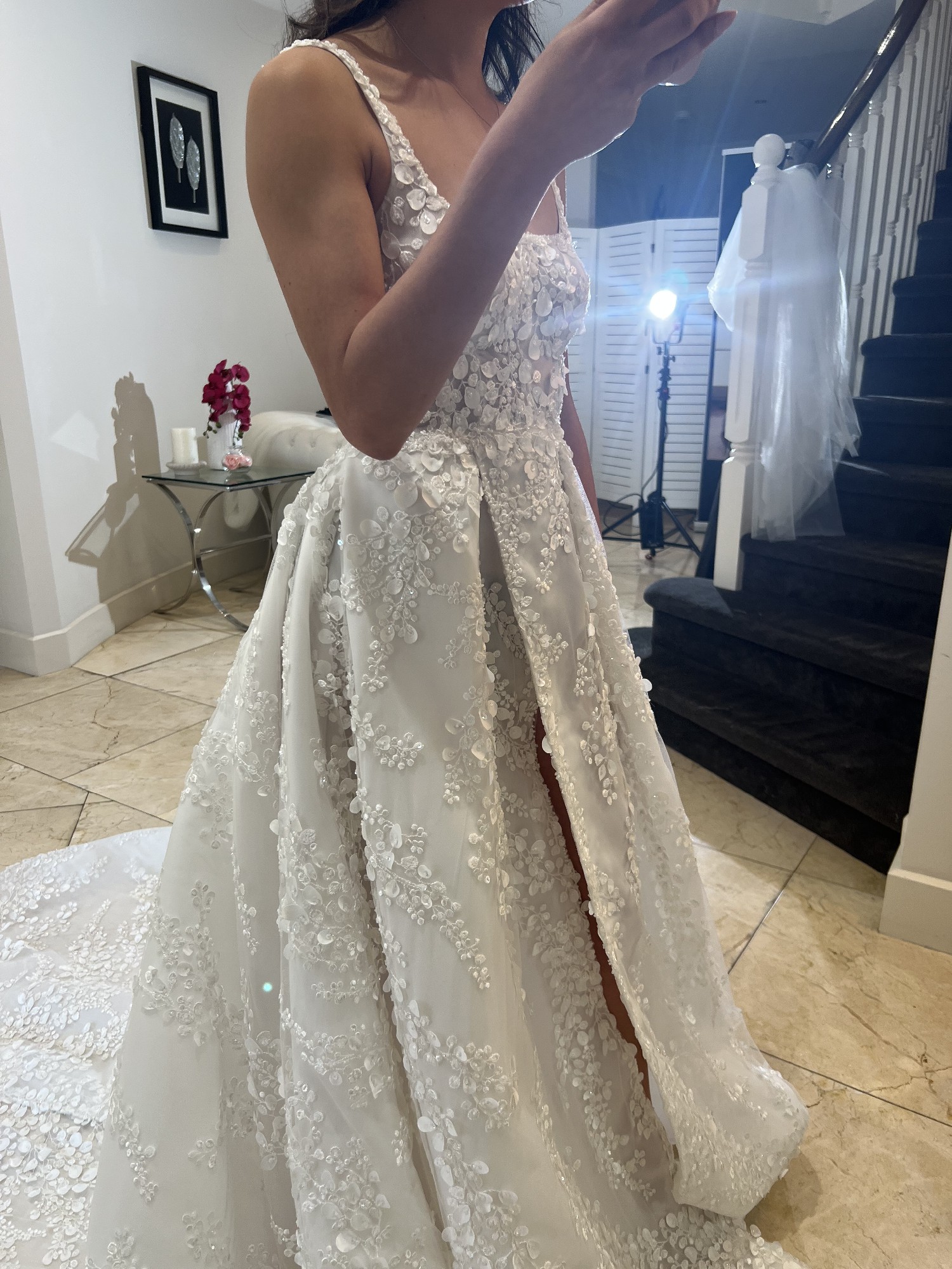 The gown has a long sweeping train with a beautiful fluted edge, which looks amazing in photos.