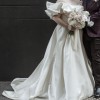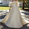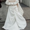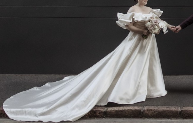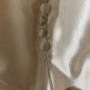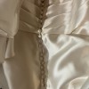 Mikado silk, light gold, very comfortable. Minor flaws are the bustle tack point is cracked and a button on the back is missing but spare buttons included. No marks or stains on dress. Puff sleeves are not worn and included. Dry cleaned and in garment bag in smoke/pet free home. Open to price negotiation as I am moving house and would like dress gone.