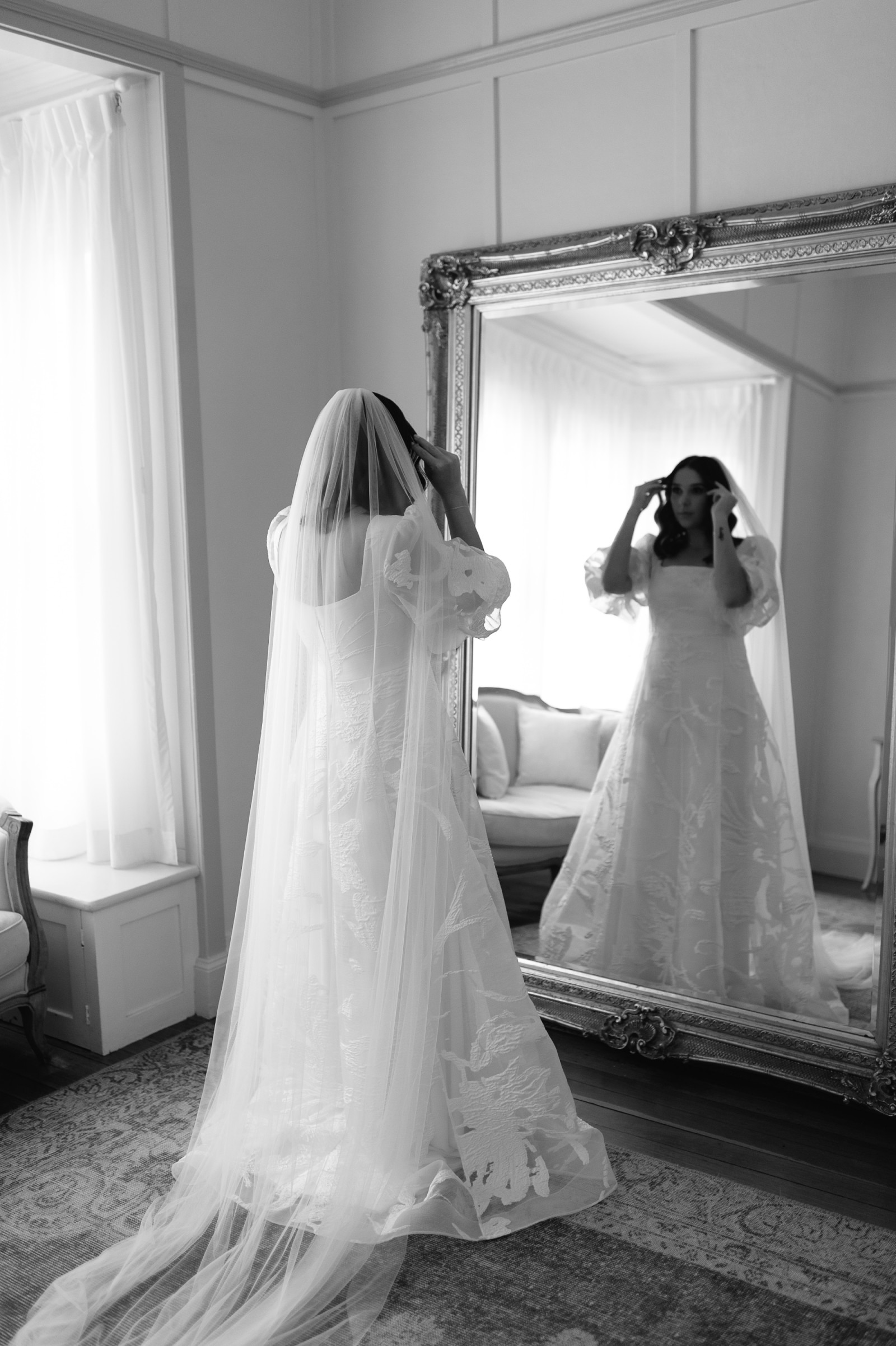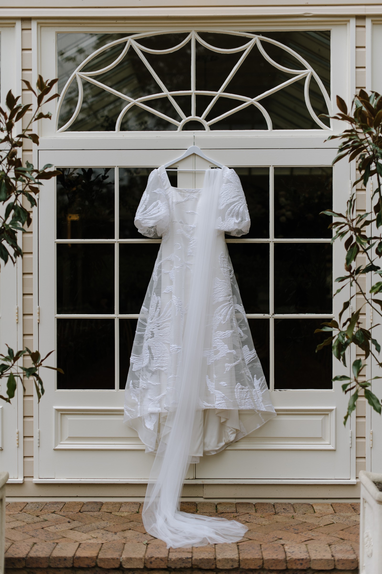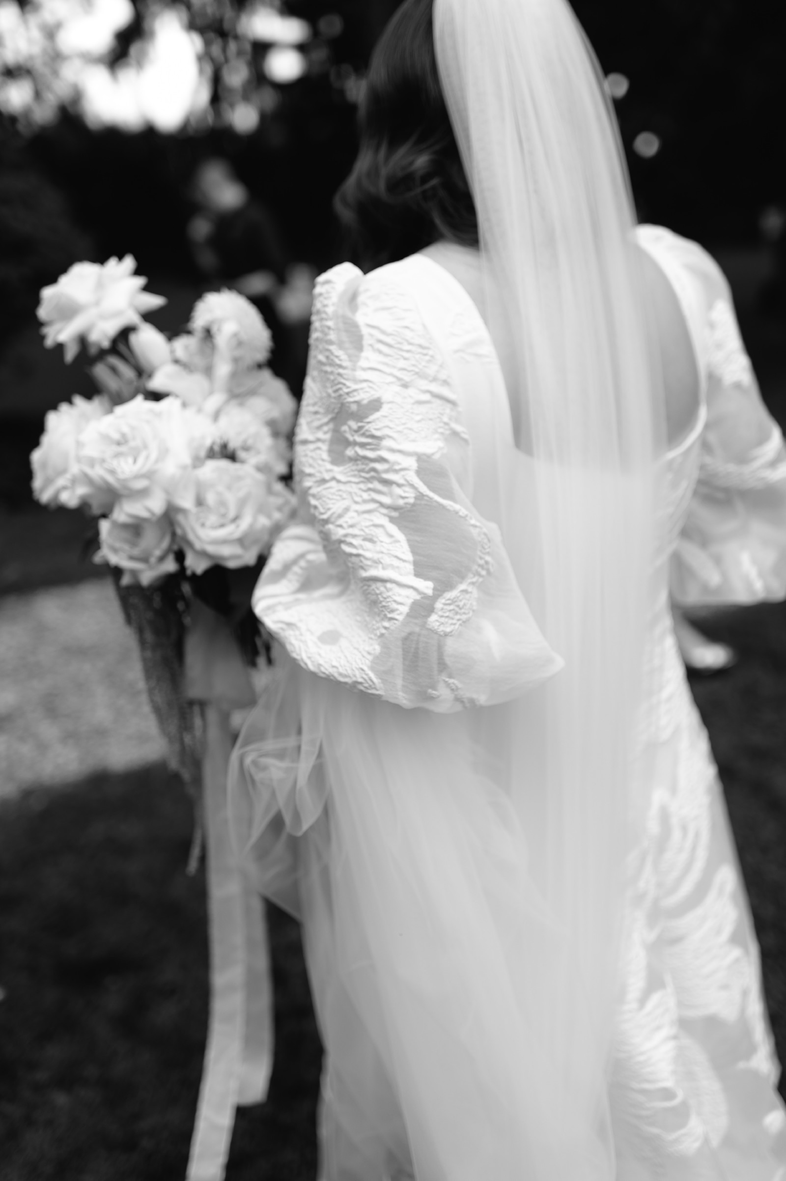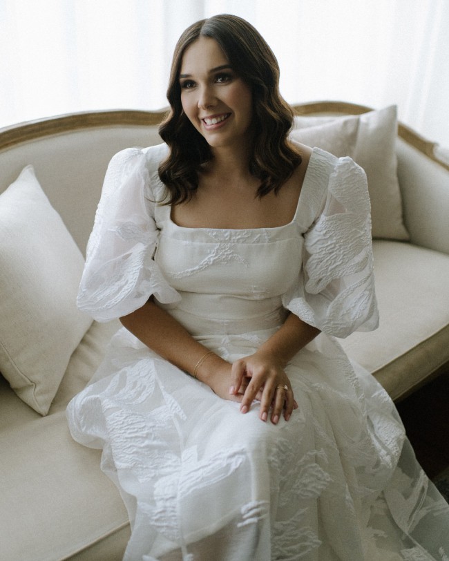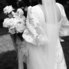 The Prea James Amelie Gown is feminine, whimsical and a dream for any bride looking to make a statement. Designed with a square neck bodice, a sculptural fluted skirt and exaggerated puff sleeves, this gown is crafted from a beautiful burnout organza fabric that adds texture and depth.